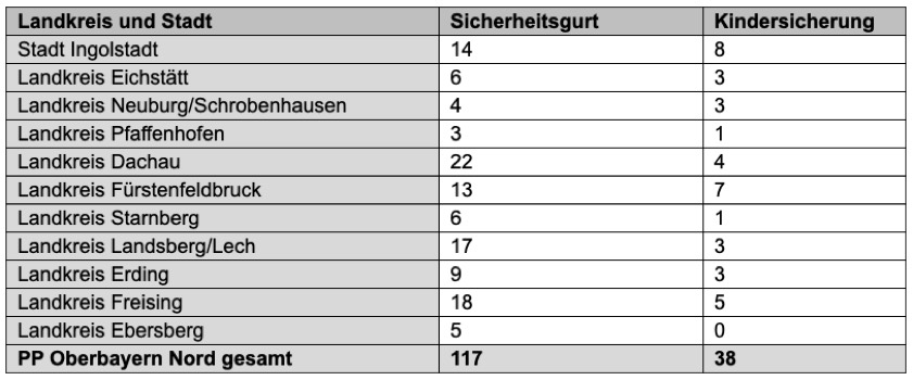 (ty) Am heutigen Mittwoch hat das in Ingolstadt ansässige Polizeipräsidium Oberbayern-Nord die Bilanz der Kontroll-Aktion veröffentlicht, die in der vergangenen Woche – wie angekündigt – von Dienstag bis Freitag im gesamten Zuständigkeits-Gebiet durchgeführt worden war. Den Angaben zufolge sei von den Beamten dabei ein besonderes Augenmerk auf die Gurt-Anlege- und Kinder-Sicherungs-Pflicht gelegt worden. Die Überprüfungen erfolgten "zu den relevanten Zeiten" im Bereich von Schulen und Kitas sowie auf stark frequentierten Schulwegen. Nachfolgend die Details sowie Zahlen aus den einzelnen Landkreisen.
