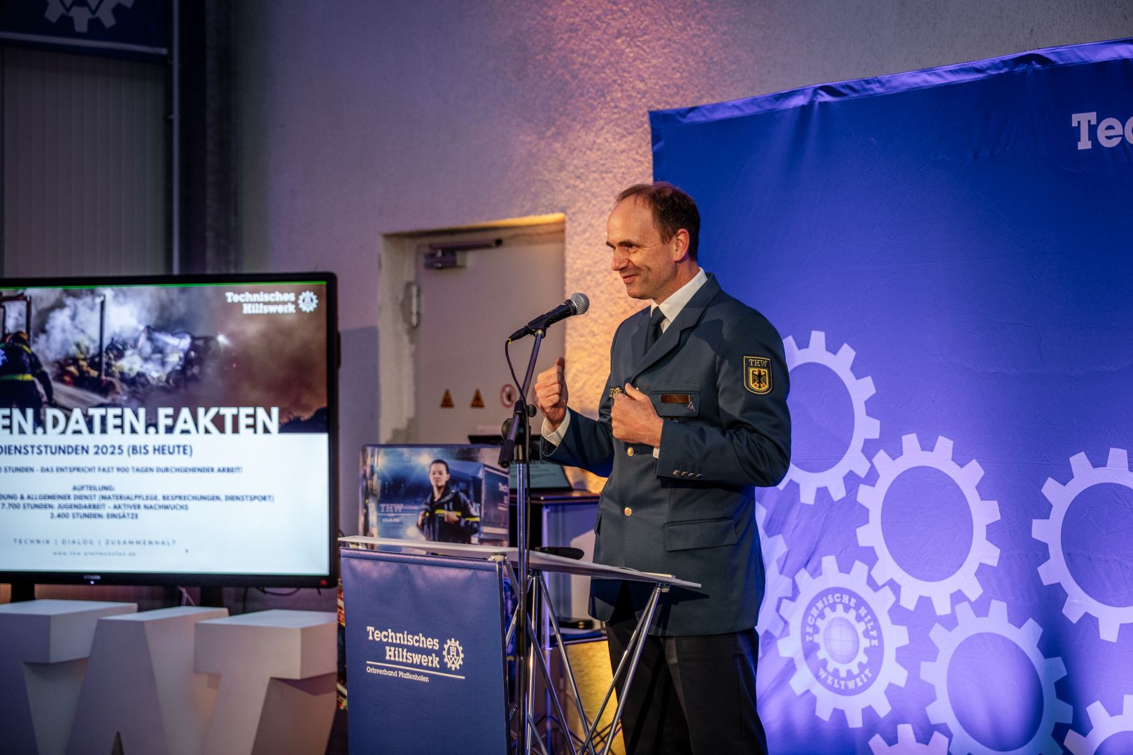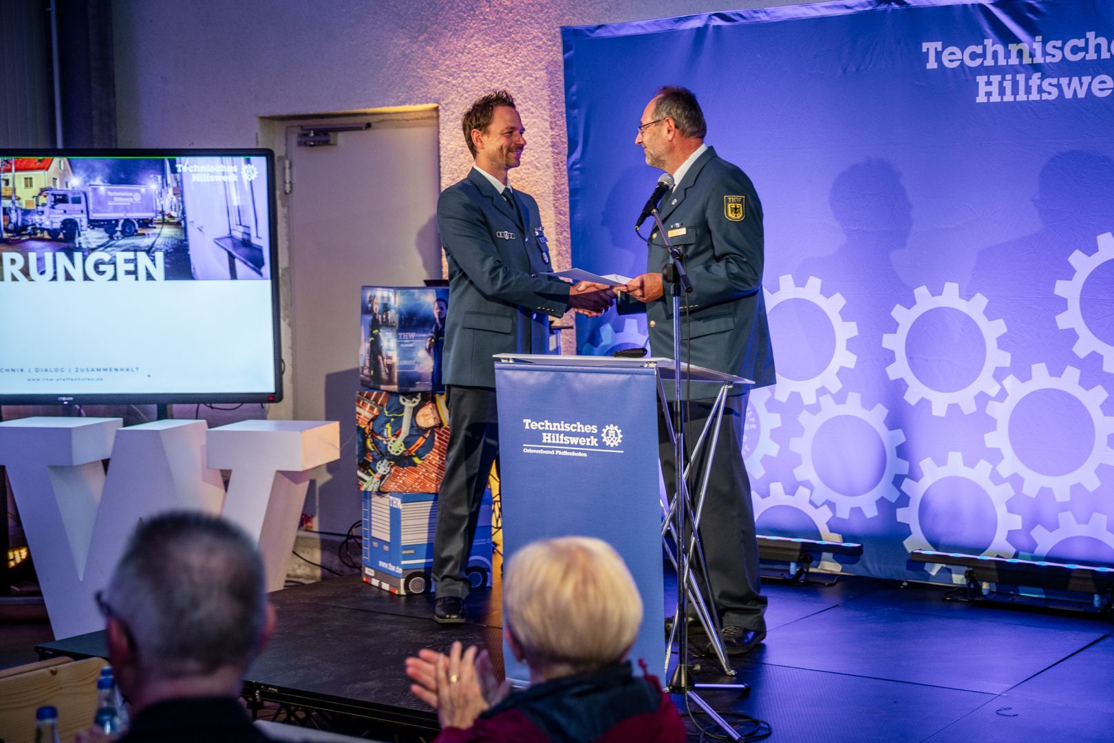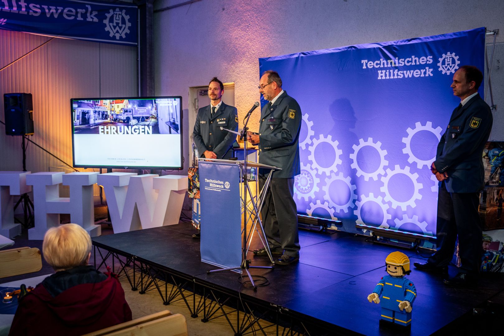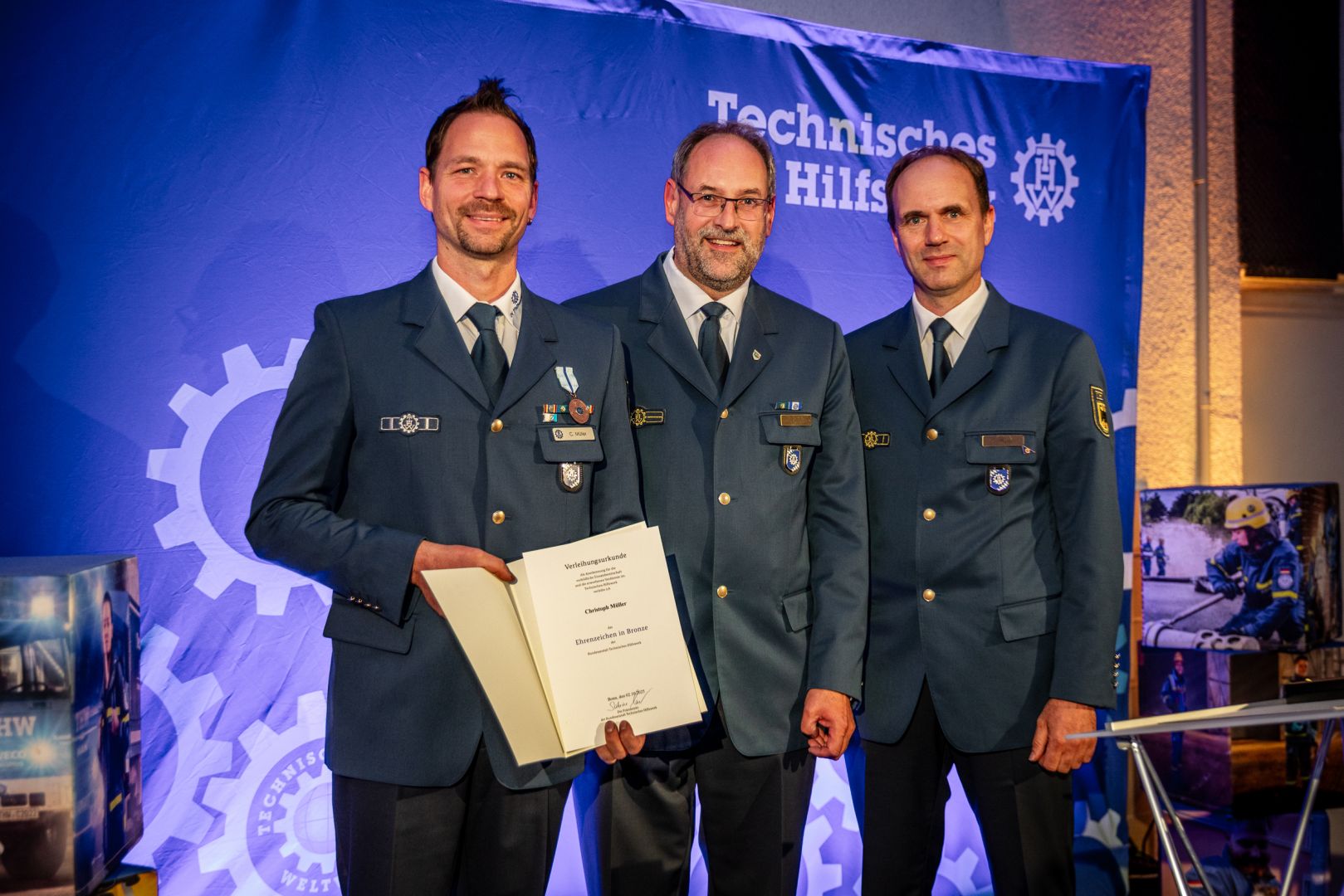 Ein Höhepunkt der Zusammenkunft war die Auszeichnung von Schirrmeister Christoph Müller mit dem bronzenen THW-Ehrenzeichen. Müller, der seit 2001 im Ortsverband aktiv ist, engagiere sich seit vielen Jahren auf vielfältige Weise – als Ausbilder, Prüfer, Auslands-Experte und bei Hochwasser-Einsätzen sowie durch sein unermüdliches Engagement in den Bereichen Technik und Ausbildung. Christoph Müllers Einsatz stehe stellvertretend für das, was das THW und die Gesellschaft trage, betonte Klaus Labitzke, der Leiter der THW-Regionalstelle, in seiner Ansprache: "unermüdliches ehrenamtliches Engagement für den Schutz anderer".