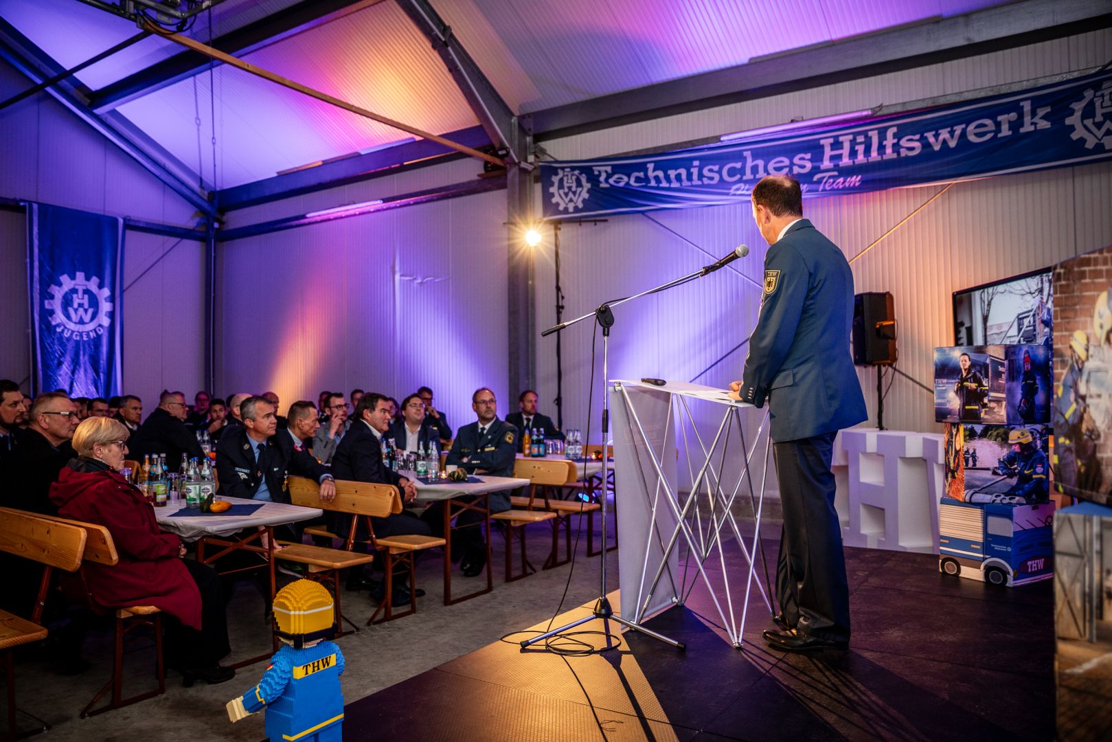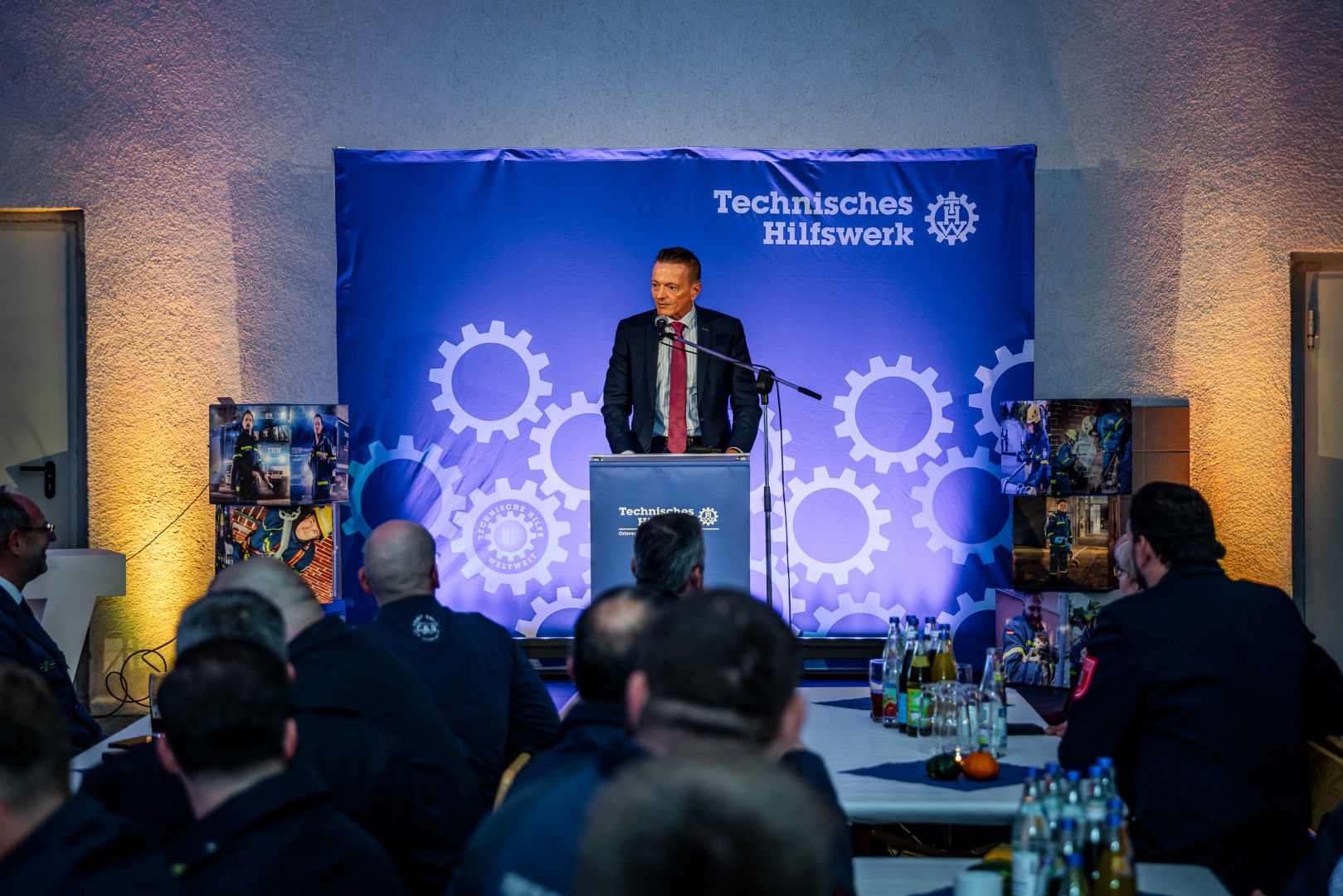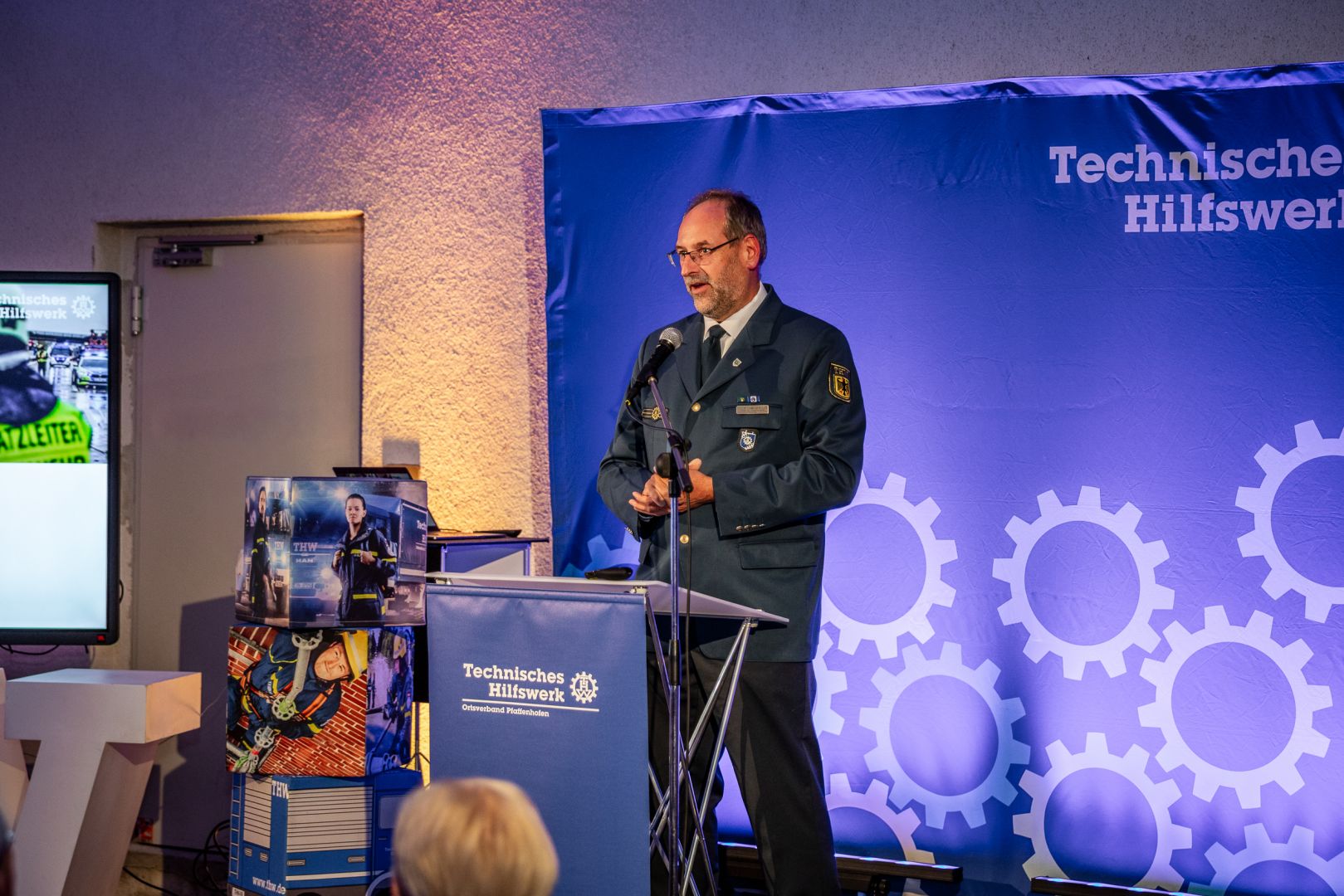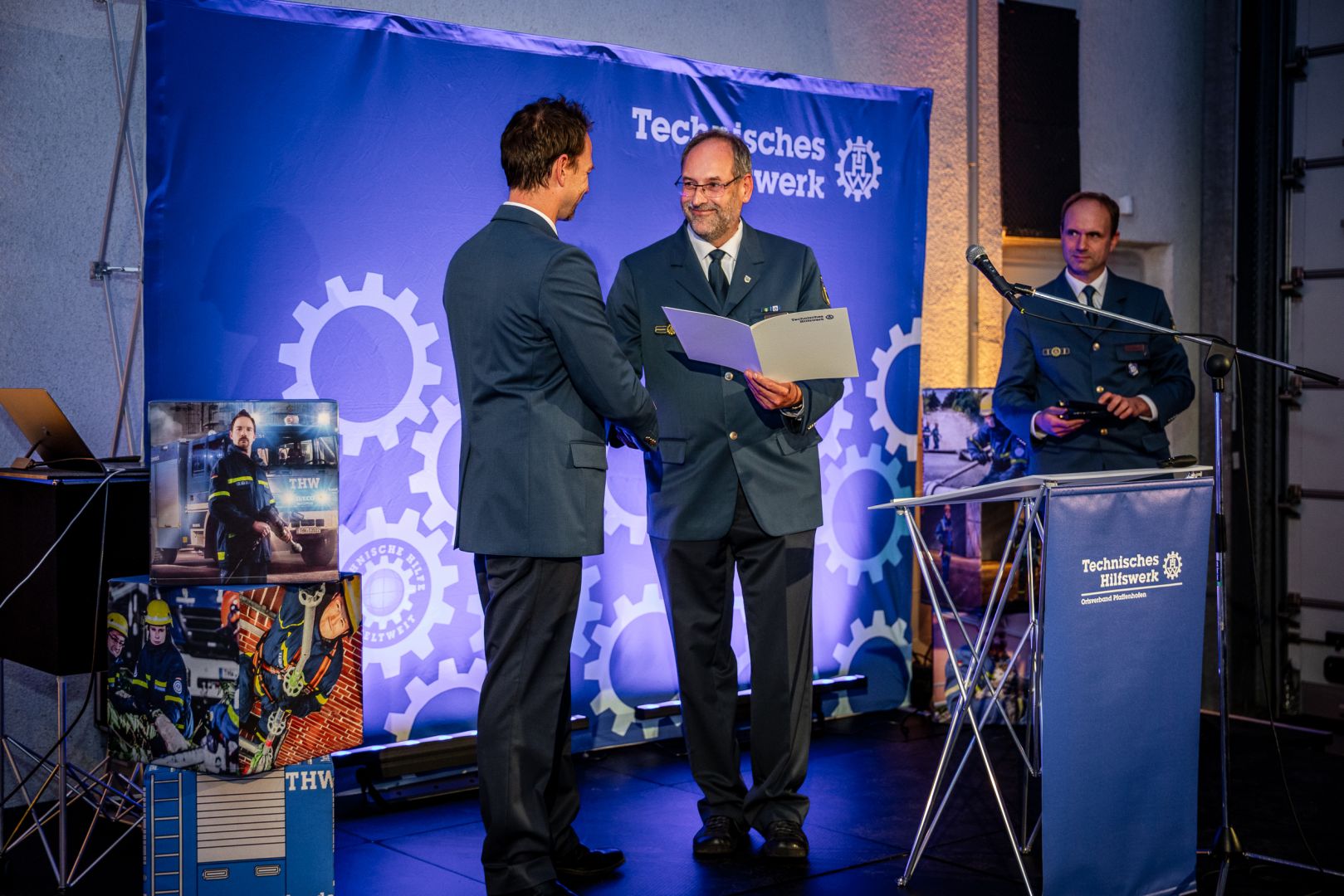 Ein Höhepunkt der Zusammenkunft war die Auszeichnung von Schirrmeister Christoph Müller mit dem bronzenen THW-Ehrenzeichen. Müller, der seit 2001 im Ortsverband aktiv ist, engagiere sich seit vielen Jahren auf vielfältige Weise – als Ausbilder, Prüfer, Auslands-Experte und bei Hochwasser-Einsätzen sowie durch sein unermüdliches Engagement in den Bereichen Technik und Ausbildung. Christoph Müllers Einsatz stehe stellvertretend für das, was das THW und die Gesellschaft trage, betonte Klaus Labitzke, der Leiter der THW-Regionalstelle, in seiner Ansprache: "unermüdliches ehrenamtliches Engagement für den Schutz anderer".