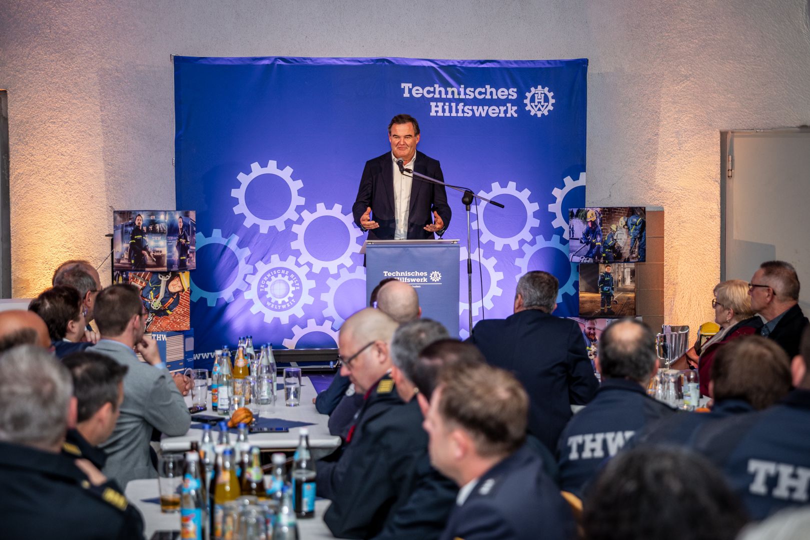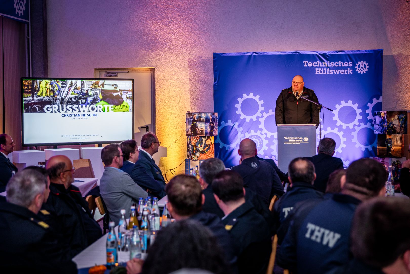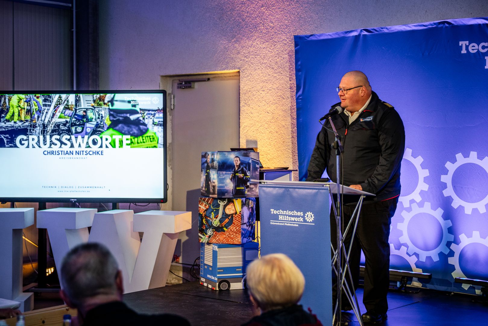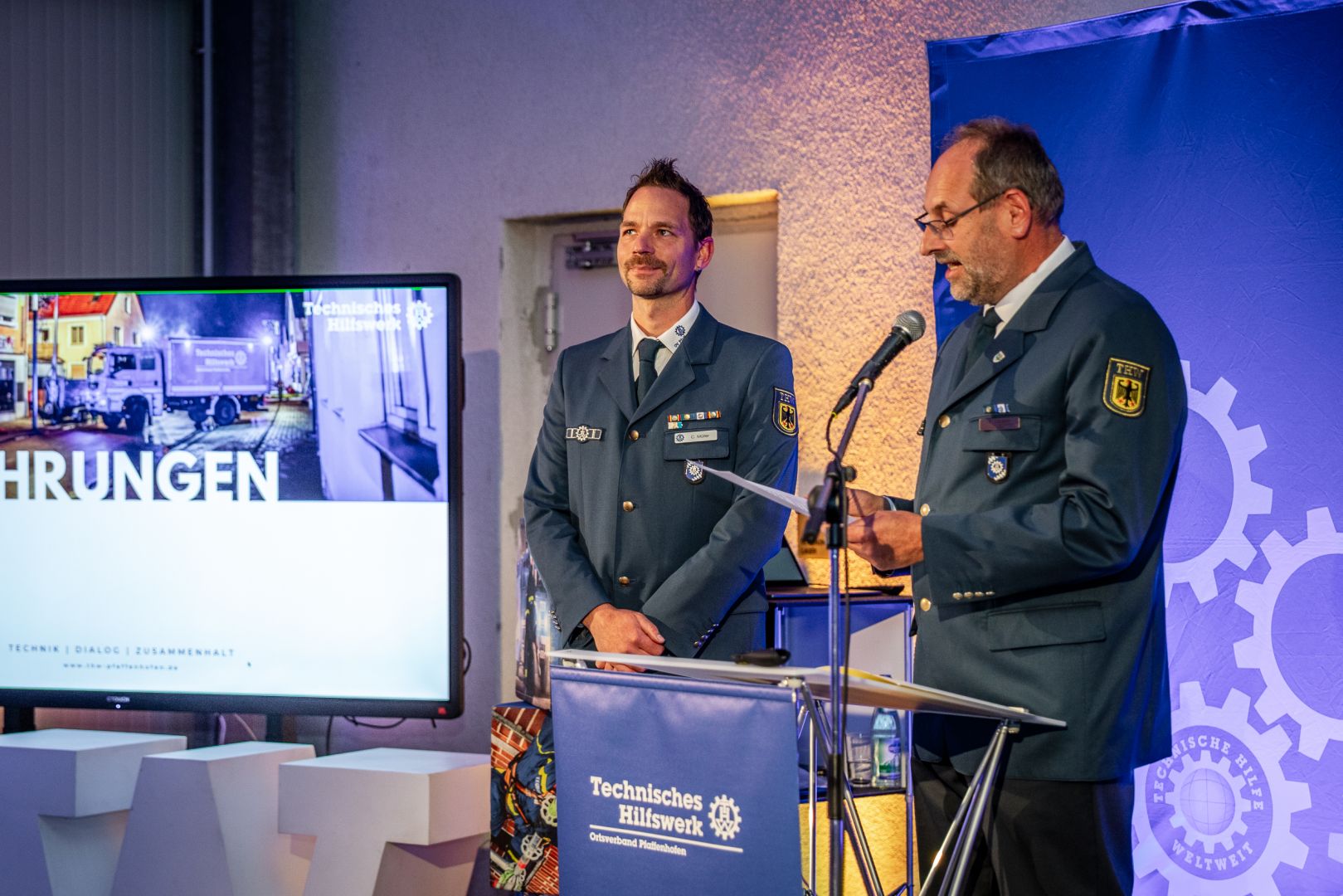 Ein Höhepunkt der Zusammenkunft war die Auszeichnung von Schirrmeister Christoph Müller mit dem bronzenen THW-Ehrenzeichen. Müller, der seit 2001 im Ortsverband aktiv ist, engagiere sich seit vielen Jahren auf vielfältige Weise – als Ausbilder, Prüfer, Auslands-Experte und bei Hochwasser-Einsätzen sowie durch sein unermüdliches Engagement in den Bereichen Technik und Ausbildung. Christoph Müllers Einsatz stehe stellvertretend für das, was das THW und die Gesellschaft trage, betonte Klaus Labitzke, der Leiter der THW-Regionalstelle, in seiner Ansprache: "unermüdliches ehrenamtliches Engagement für den Schutz anderer".