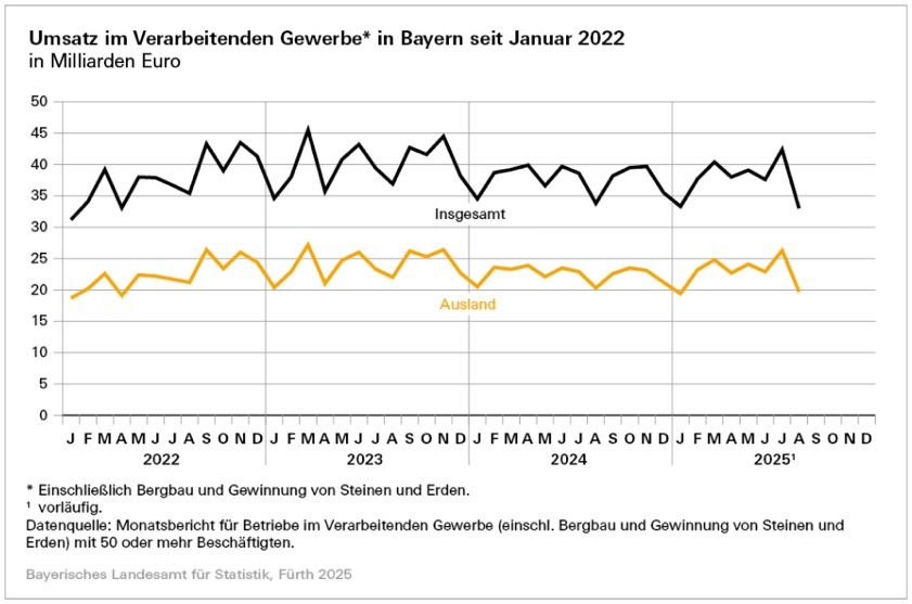Wie das Landesamt für Statistik weiter mitteilt, entfielen von den 33,0 Milliarden Euro des Gesamt-Umsatzes rund 19,7 Milliarden Euro auf Umsätze mit dem Ausland (minus 2,9 Prozent) und darunter rund 6,2 Milliarden Euro auf Umsätze mit den Ländern der Euro-Zone (minus 4,3 Prozent). Die Anteile der Auslands-Umsätze und der Umsätze mit den Euro-Zonen-Ländern am Gesamt-Umsatz machten 59,7 beziehungsweise 18,7 Prozent aus. Die Nachfrage nach Gütern des bayerischen verarbeitenden Gewerbes verringerte sich im August heuer gegenüber dem Vorjahres-Monat preisbereinigt um 0,4 Prozent. Die Bestell-Eingänge aus dem Ausland erhöhten sich dabei um 0,7 Prozent, während die Inlands-Aufträge um 2,4 Prozent zurückgingen.