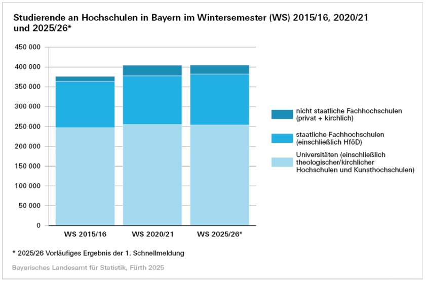 Im Zehnjahres-Vergleich nimmt die Zahl der Studierenden in Bayern seit dem Winter-Semester 2015/16 (376 488 Studierende) um insgesamt 7,6 Prozent zu. Dabei stieg die Frauen-Quote um 1,24 Prozentpunkte auf 49,8 Prozent im Winter-Semester 2025/26. Im Vergleich zwischen dem aktuellen Semester und dem Winter-Semester 2015/16 weisen die Universitäten einen Anstieg der Studierenden-Zahlen von 2,5 Prozent auf, das ist ein Plus von 6155 Studierenden. Bei den Fachhochschulen (inklusive der Hochschulen für den öffentlichen Dienst) ist ein Plus von 17,0 Prozent zu verzeichnen, dies entspricht 22 020 Studierenden mehr.