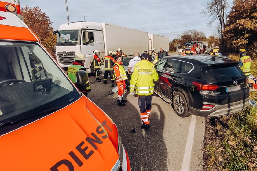 (ty) Ein schwerer Verkehrsunfall hat sich am gestrigen Nachmittag im Gemeinde-Bereich von Bergkirchen (Kreis Dachau) ereignet. Das Unglück geschah gegen 13.30 Uhr auf der Staatsstraße 2339 an der Einmündung bei Feldgeding, zwei Pkw und ein Lkw waren in das Geschehen verwickelt. Wie aus einer Mitteilung der örtlich zuständigen Polizeiinspektion aus Dachau hervorgeht, wurden ein 49-Jähriger und dessen 15-jähriger Sohn jeweils schwer verletzt. Ein 18-Jähriger und dessen Vater erlitten jeweils leichte Verletzungen.