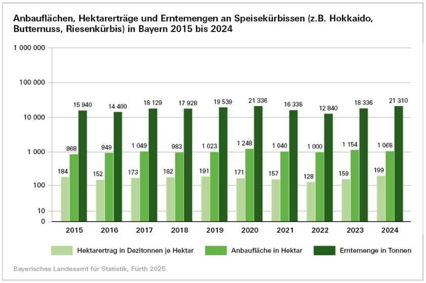 Bayerns Anteil an der deutschen Gesamt-Erzeugung von Speise-Kürbissen im Freiland von 114 284 Tonnen lag im vergangenen Jahr bei 18,6 Prozent. Mit den besagten 21 310 Tonnen belegte der Freistaat im Bundes-Ranking Platz drei – nur Rheinland-Pfalz und Nordrhein-Westfalen erzeugten mit 23 167 Tonnen beziehungsweise 26 972 Tonnen mehr Speise-Kürbisse. Der in Bayern erzielte Hektar-Ertrag lag im vergangenen Jahr mit 199,5 Dezitonnen pro Hektar um 25,5 Prozent höher als im Jahr zuvor, als 158,9 Dezitonnen pro Hektar errechnet wurden.