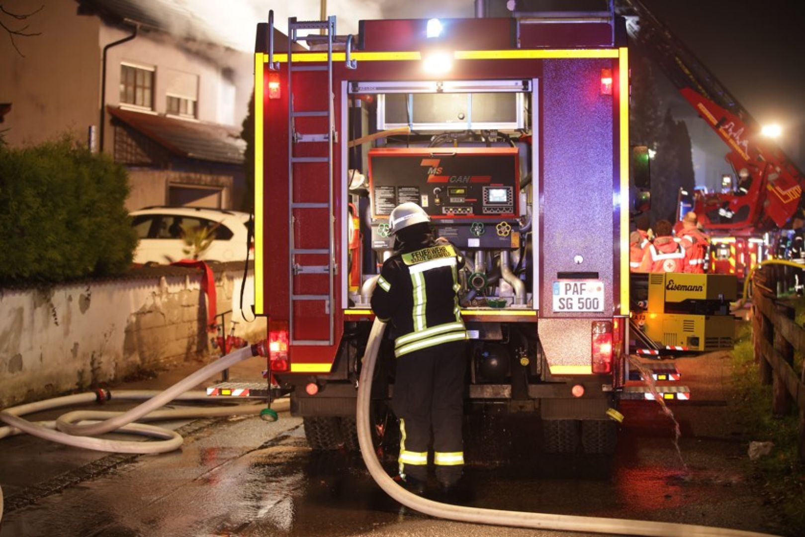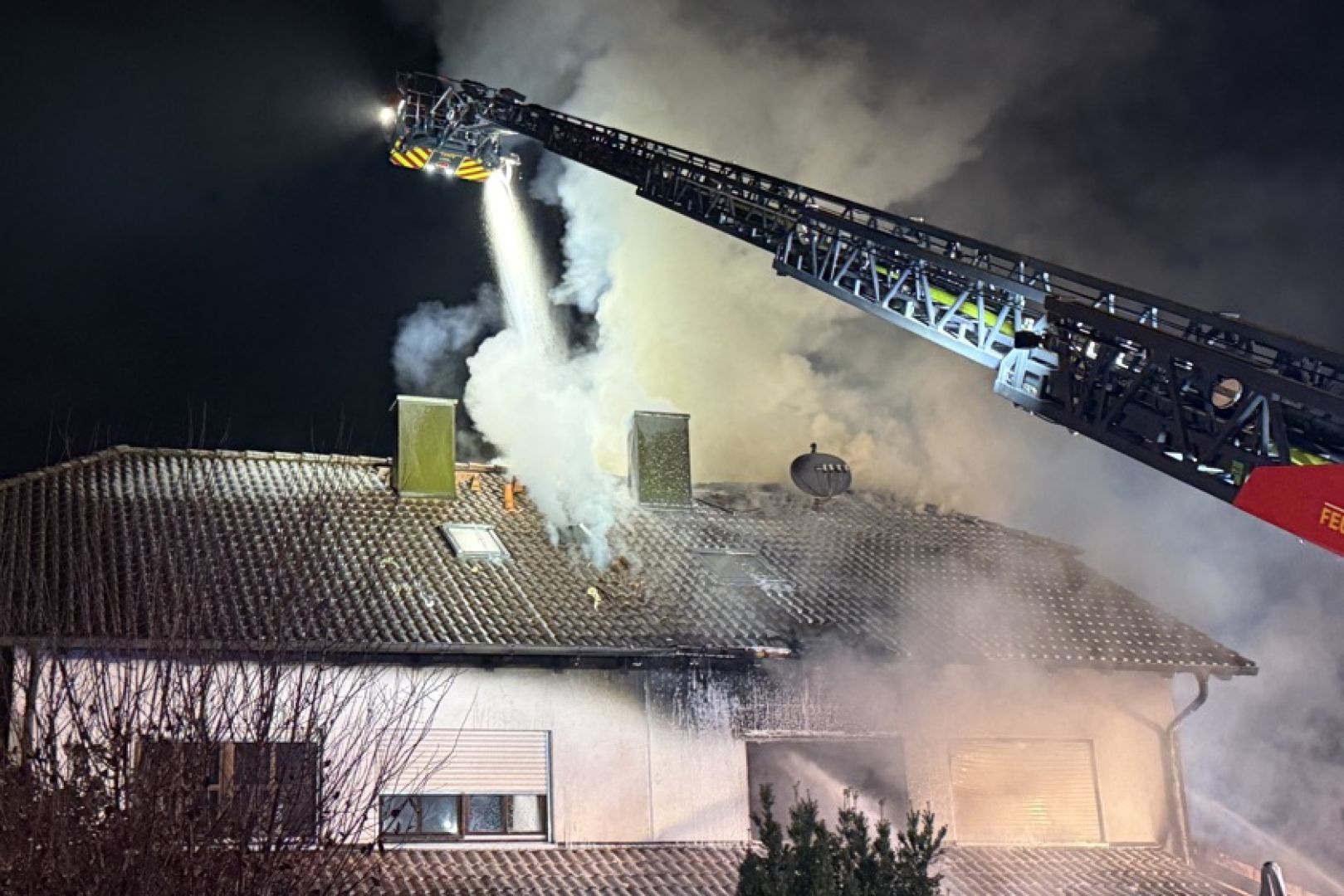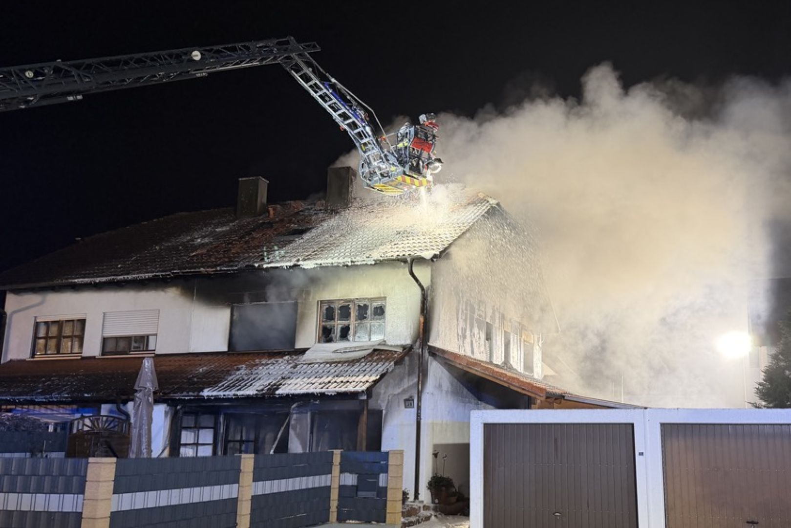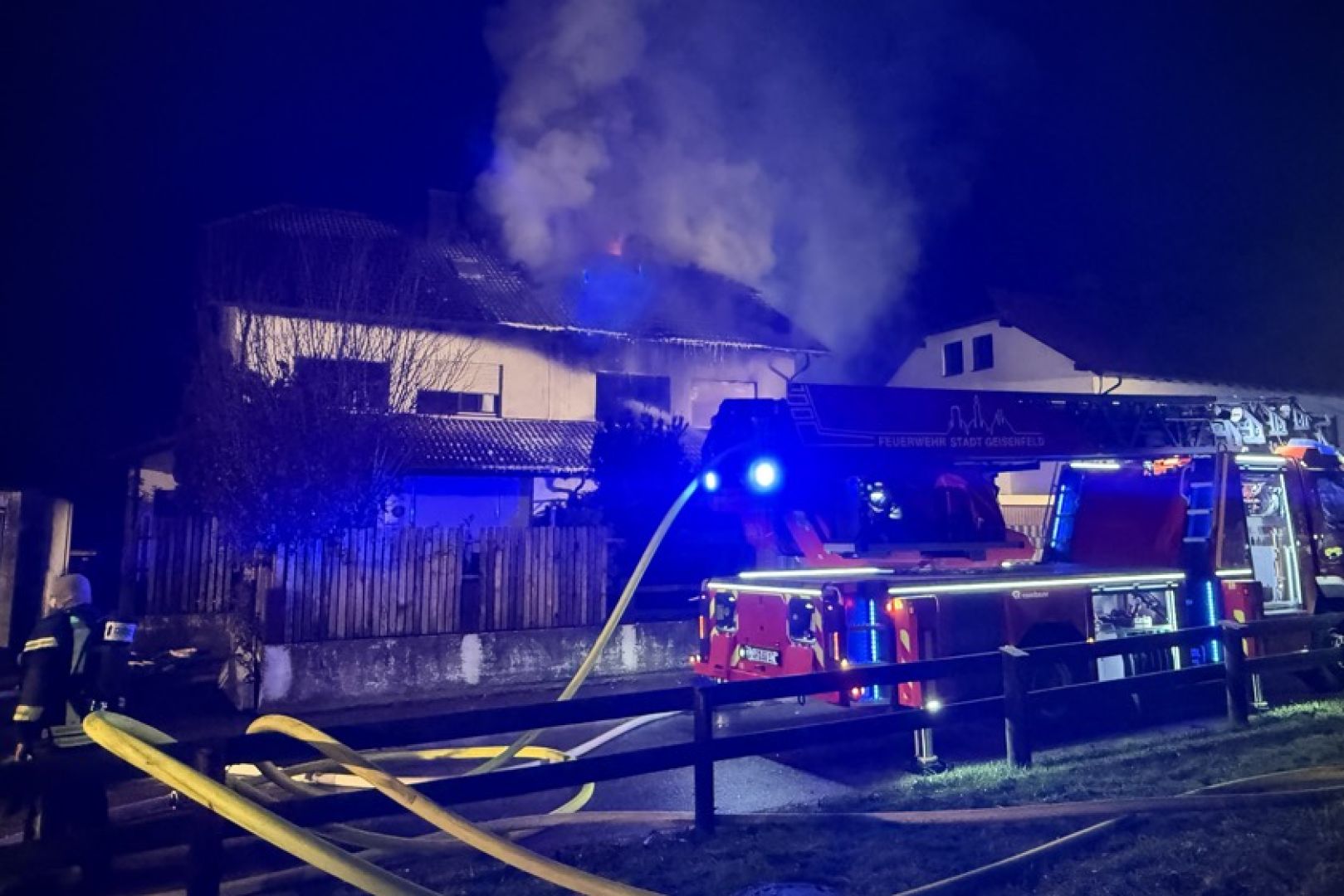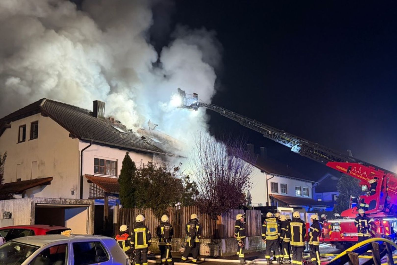 Ein Großaufgebot von Feuerwehr und Rettungsdienst war am gestrigen Sonntag gegen 17.30 Uhr wegen der in Vollbrand stehenden Doppelhaus-Hälfte alarmiert worden. Wie die Nachrichten-Agentur "vifogra" schilderte, war eine dunkle Rauchwolke bereits von Weitem zu sehen. Den Angaben zufolge schlugen Flammen aus dem Dach des betroffenen Gebäudes. Aufgrund der hohen Zahl von angerückten Einsatzkräften – laut BRK waren zeitweise rund 240 Helferinnen und Helfer von Feuerwehr, Polizei, Rettungsdienst und Technischem Hilfswerk (THW) vor Ort – war auch die Schnell-Einsatz-Gruppe "Betreuung und Verpflegung" des Roten Kreuzes angefordert worden. Diese stellte die Versorgung mit Getränken und Essen sicher.