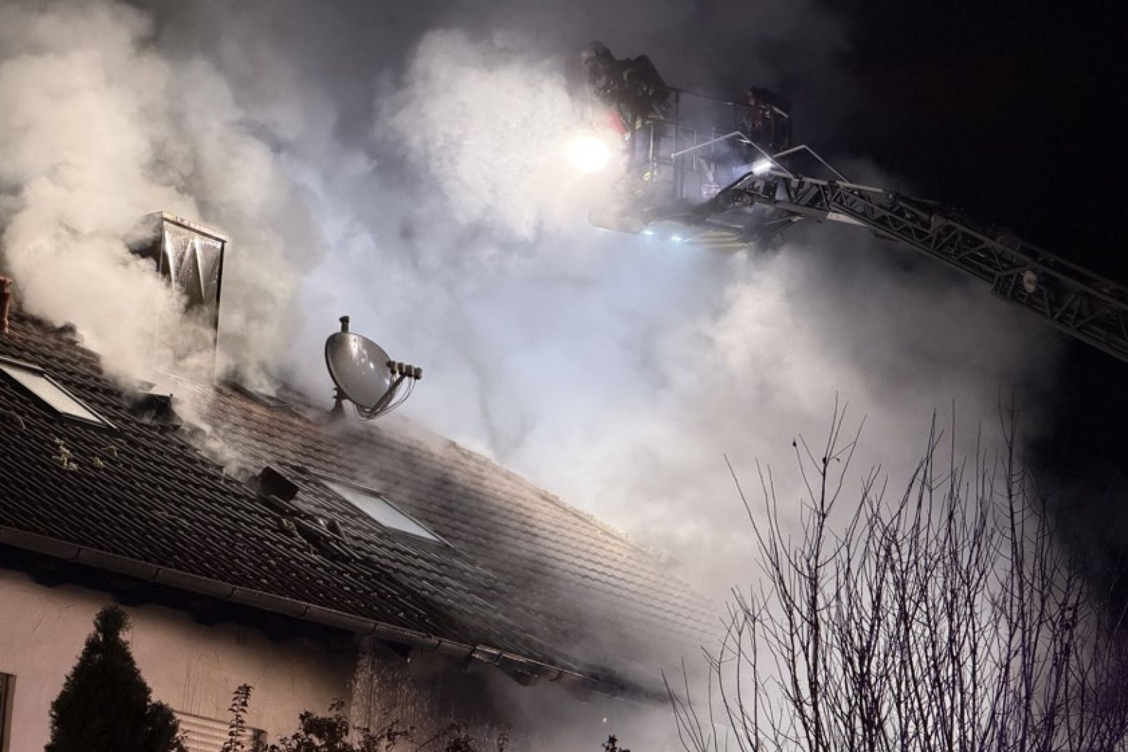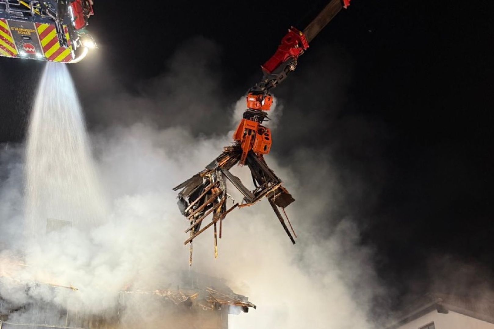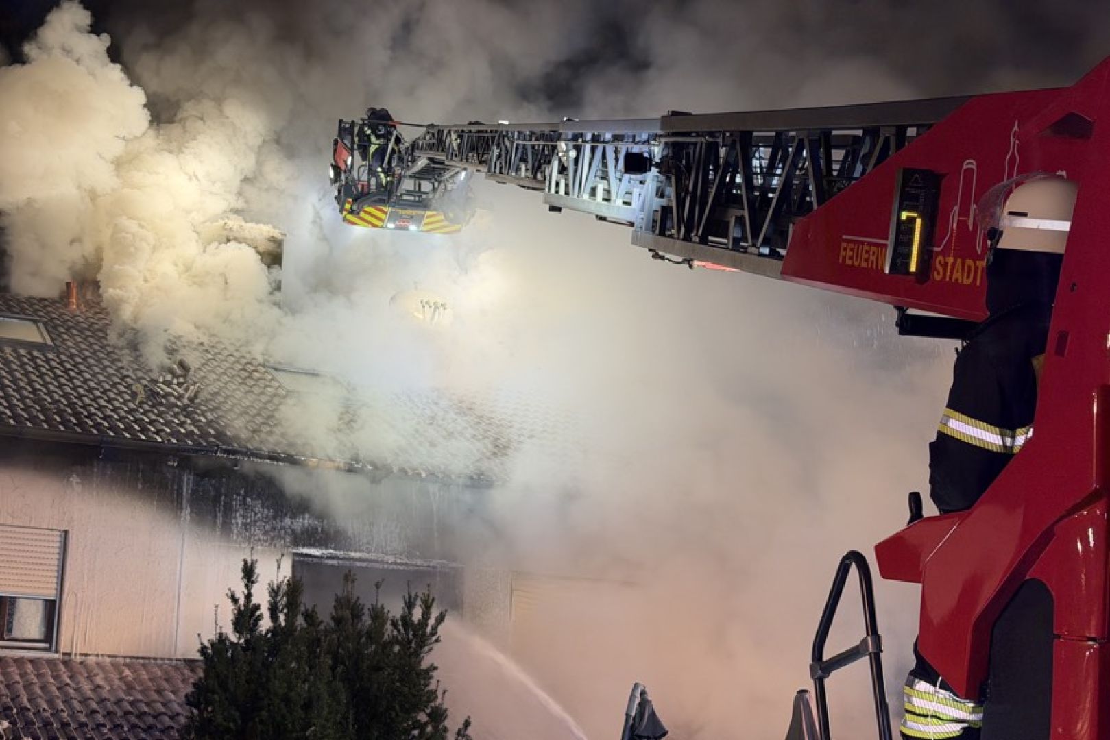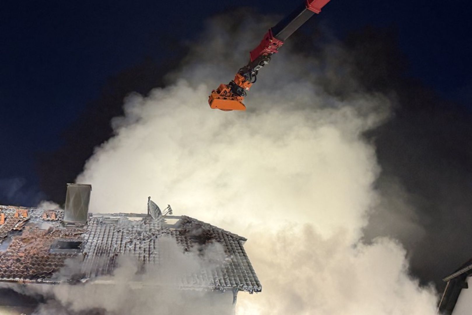Ein Großaufgebot von Feuerwehr und Rettungsdienst war am gestrigen Sonntag gegen 17.30 Uhr wegen der in Vollbrand stehenden Doppelhaus-Hälfte alarmiert worden. Wie die Nachrichten-Agentur "vifogra" schilderte, war eine dunkle Rauchwolke bereits von Weitem zu sehen. Den Angaben zufolge schlugen Flammen aus dem Dach des betroffenen Gebäudes. Aufgrund der hohen Zahl von angerückten Einsatzkräften – laut BRK waren zeitweise rund 240 Helferinnen und Helfer von Feuerwehr, Polizei, Rettungsdienst und Technischem Hilfswerk (THW) vor Ort – war auch die Schnell-Einsatz-Gruppe "Betreuung und Verpflegung" des Roten Kreuzes angefordert worden. Diese stellte die Versorgung mit Getränken und Essen sicher.
