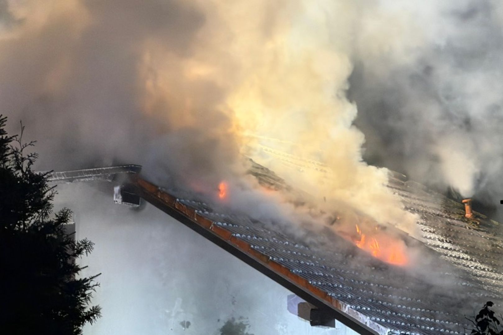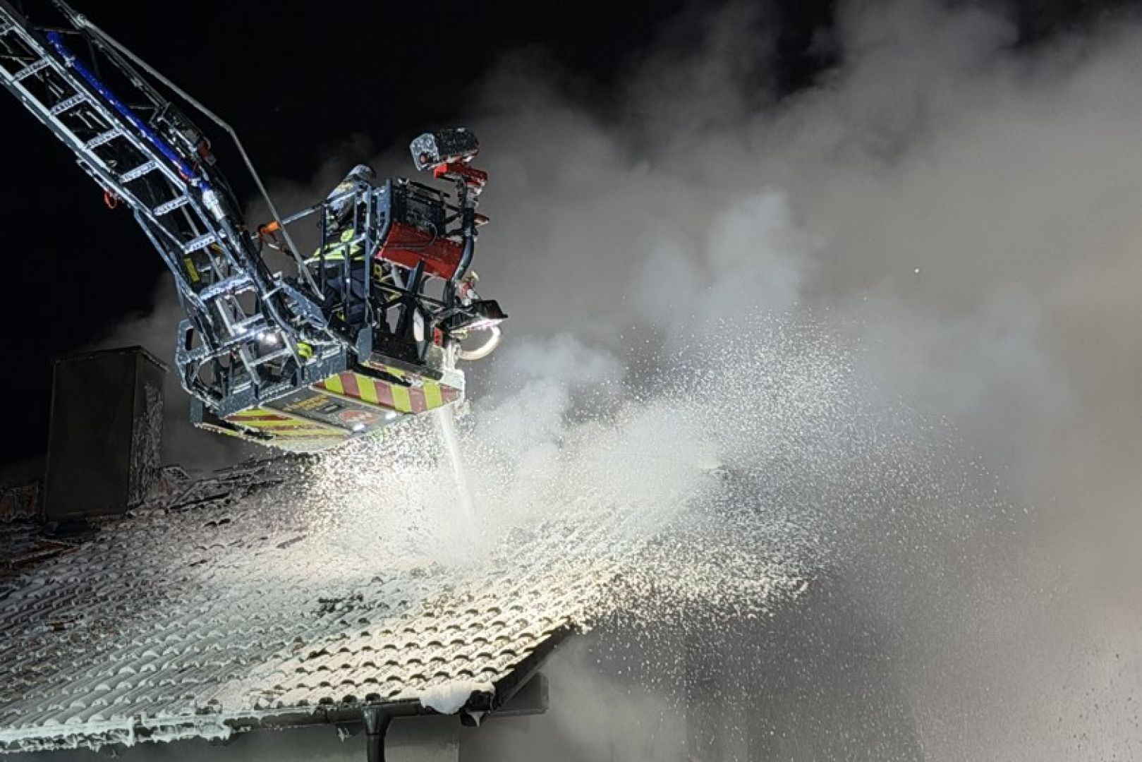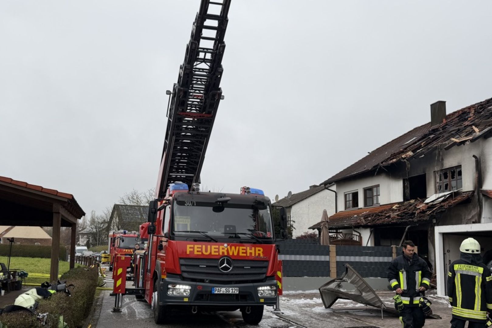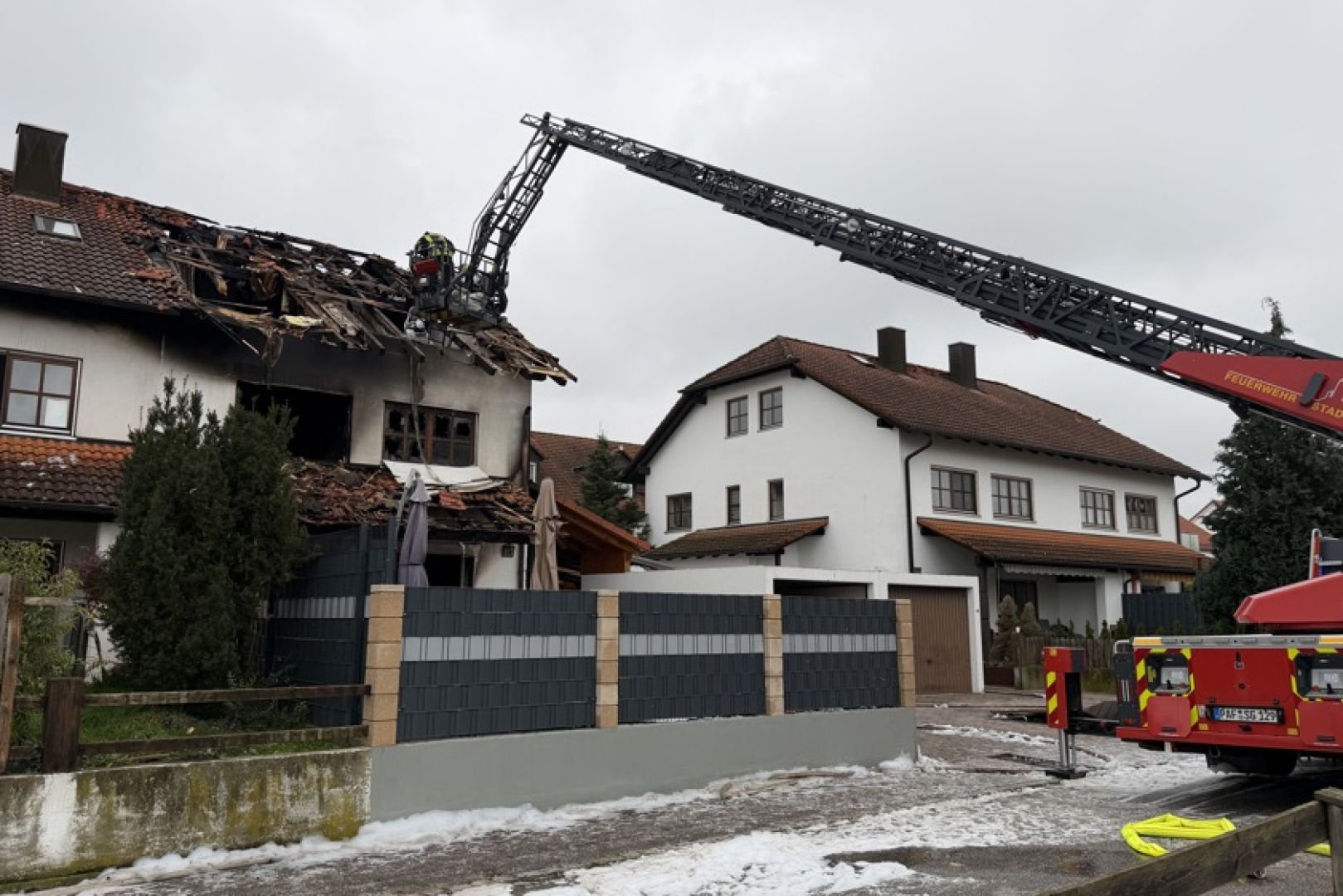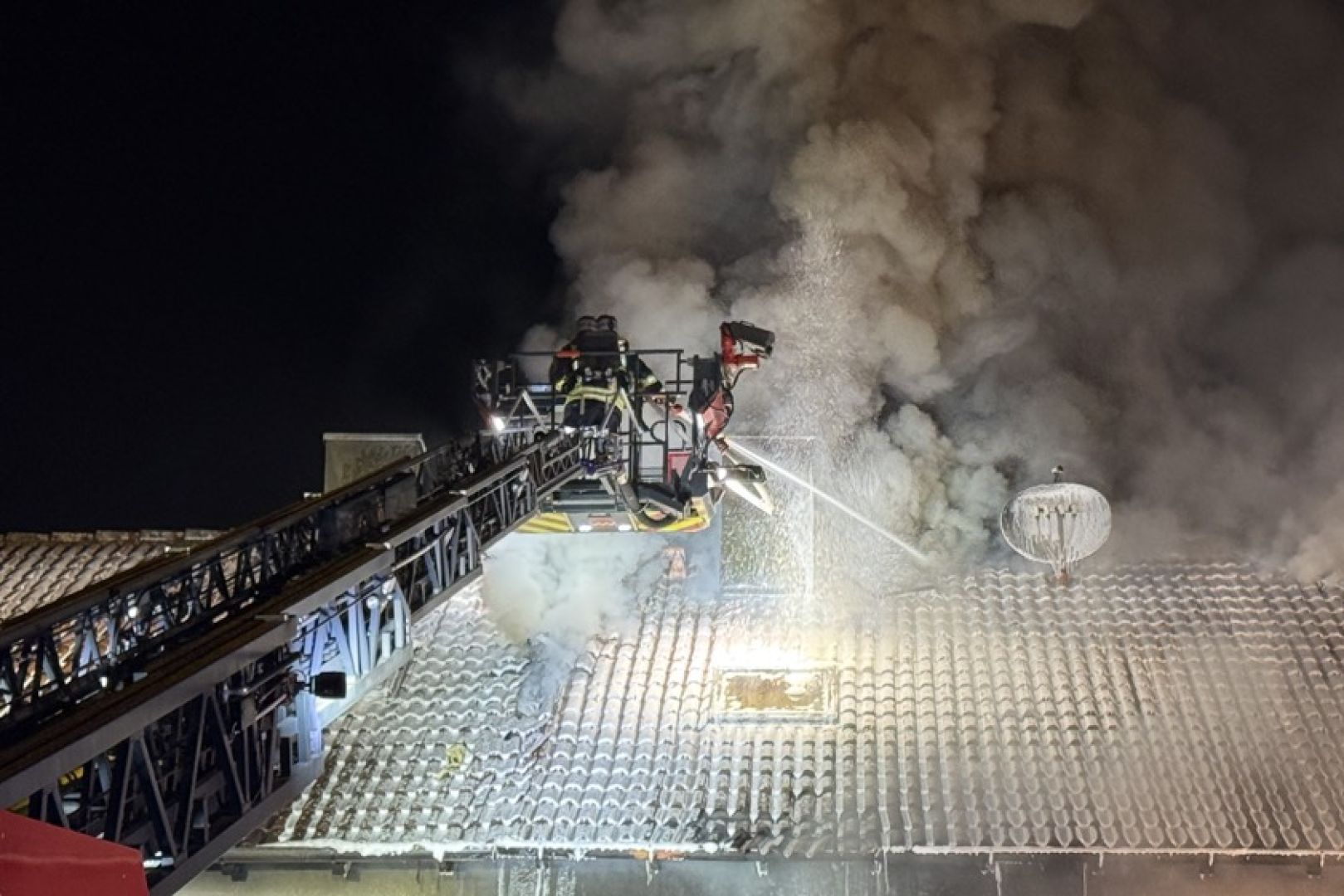 Ein Großaufgebot von Feuerwehr und Rettungsdienst war am gestrigen Sonntag gegen 17.30 Uhr wegen der in Vollbrand stehenden Doppelhaus-Hälfte alarmiert worden. Wie die Nachrichten-Agentur "vifogra" schilderte, war eine dunkle Rauchwolke bereits von Weitem zu sehen. Den Angaben zufolge schlugen Flammen aus dem Dach des betroffenen Gebäudes. Aufgrund der hohen Zahl von angerückten Einsatzkräften – laut BRK waren zeitweise rund 240 Helferinnen und Helfer von Feuerwehr, Polizei, Rettungsdienst und Technischem Hilfswerk (THW) vor Ort – war auch die Schnell-Einsatz-Gruppe "Betreuung und Verpflegung" des Roten Kreuzes angefordert worden. Diese stellte die Versorgung mit Getränken und Essen sicher.