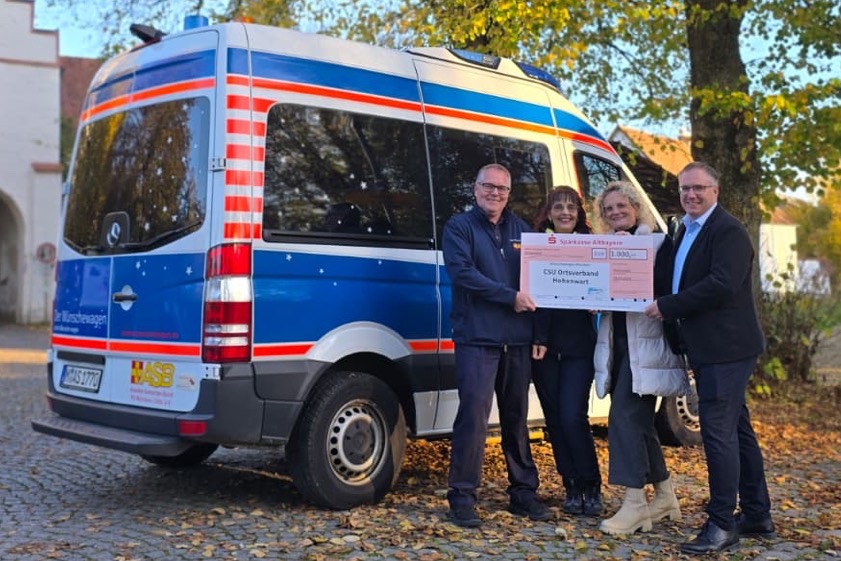 (ty) Eine Spende in Höhe von 1000 Euro hat der CSU-Ortsverband von Hohenwart an den "Wünschewagen" München-Oberbayern des Arbeiter-Samariter-Bundes (ASB) überreicht. Die Übergabe erfolgte im Namen der Christsozialen durch Dominik Priller, Bürgermeister-Kandidat bei der im März stattfindenden Kommunalwahl, und Andrea Widl, aktuell Dritte Bürgermeisterin der Gemeinde (Foto oben). Auf der jüngsten Herbst-Dult in Hohenwart hatte die CSU sowohl Apfel-Punsch als auch Apfel-Rum-Punsch gegen eine Spende angeboten. Der dadurch eingenommene Betrag sei schließlich aufgestockt worden, so die CSU.