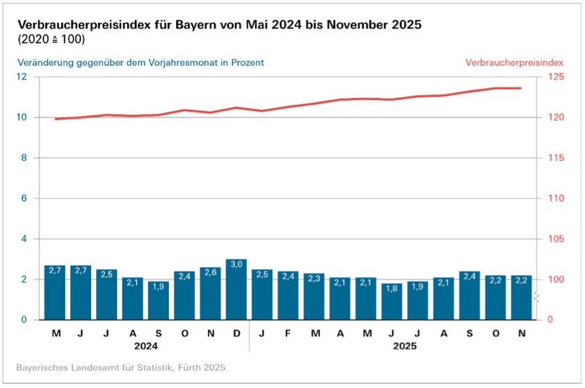 (ty) Im Freistaat sind die Verbraucher-Preise im zu Ende gehenden November gegenüber dem Vorjahres-Monat um 2,2 Prozent gestiegen. Das wurde am heutigen Freitag aus dem bayerischen Landesamt für Statistik gemeldet. Den Angaben zufolge kosten Nahrungsmittel 1,6 Prozent mehr als vor einem Jahr; Energie kann hingegen um 0,7 Prozent günstiger bezogen werden. Im Vergleich zum Vormonat Oktober sanken die Verbraucher-Preise um 0,2 Prozent. Nachfolgend weitere Details – auch zu einzelnen Waren – sowie zwei Grafiken.