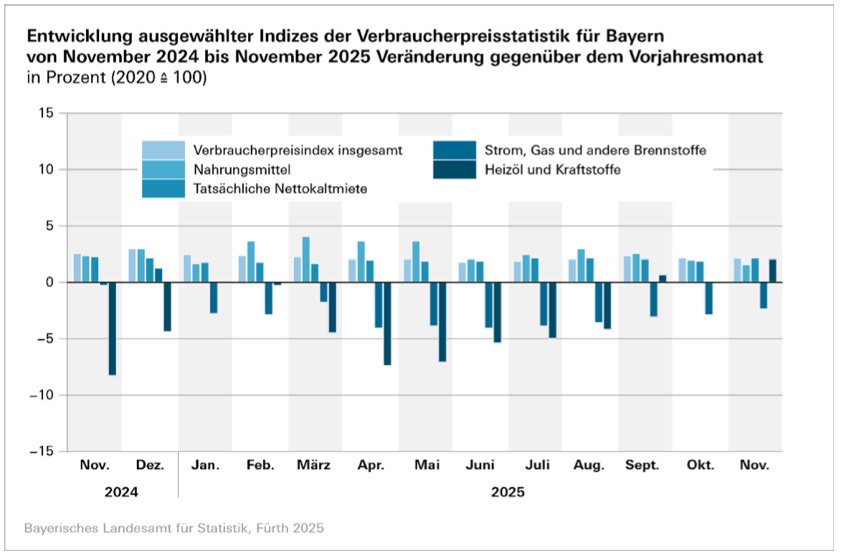 Tanken wurde im Vergleich zum Vormonat Oktober im zu Ende gehenden November um 1,3 Prozent teurer. Die Preise für Brennholz, Holzpellets oder andere feste Brennstoffe (plus 4,7 Prozent) und Heizöl (plus 6,5 Prozent) stiegen spürbar an. Moderate Preissenkungen im Vergleich zum Vormonat ergaben sich bei Erdgas (minus 0,3 Prozent) und Strom (minus 0,2 Prozent).