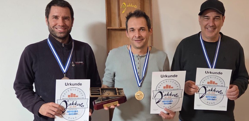 Die Sieger in der zweiten bayerische Meisterschaft im Jakkolo: Gewinner Ulrich Czarnitzki (Mitte), der Zweitplatzierte Christian Hohenstatter (rechts), und der Drittplatzierte Josef Rauscher.