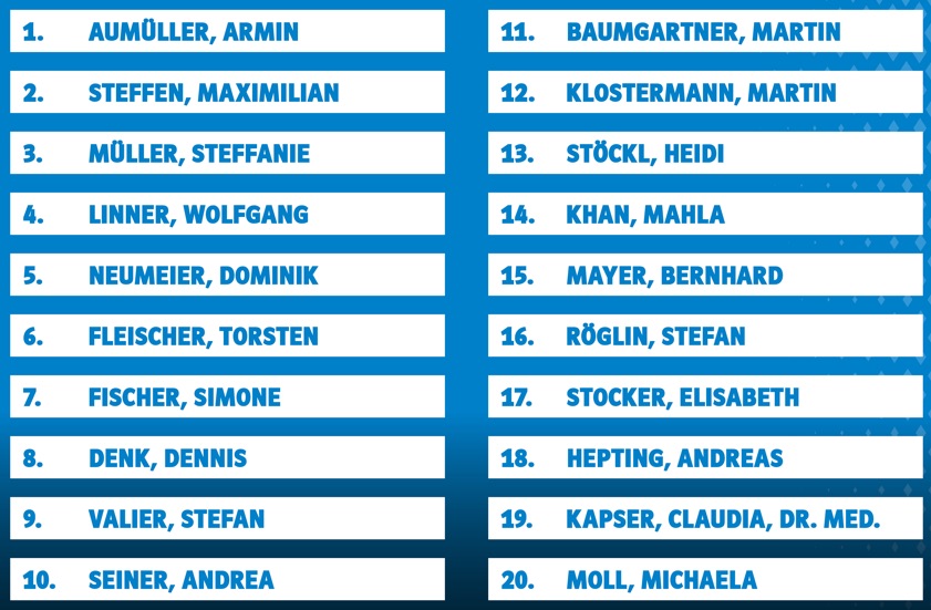 Angeführt wird die nun offiziell aufgestellte CSU-Liste vom Ortsvorsitzenden Armin Aumüller. Auf den nachfolgenden Plätzen rangieren Maximilian Steffen, Steffanie Müller, Wolfgang Linner, Dominik Neumeier, Torsten Fleischer und Simone Fischer. Aumüller betont, dass die Liste jünger und ausgewogener besetzt sei als jemals zuvor. Besonders der hohe Frauen-Anteil sowie die vielen jungen Kandidierenden seien Zeichen für Aufbruch und Erneuerung. Mit einem Durchschnitts-Alter von etwas über 40 Jahren und einem breiten beruflichen Spektrum sei die Kandidaten-Riege "ein starkes Signal für einen echten Neuanfang im Gemeinderat". Derzeit bekleidet die CSU vier der 16 Mandate im Gemeinderat und stellt mit Albert Schnell den Vize-Bürgermeister.