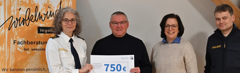 Kerstin Schaller, die Chefin des Polizeipräsidiums Oberbayern-Nord und Reinhard Kolb, Leiter der Pressestelle dieser Behörde, überreichten den Spenden-Erlös in Höhe von 750 Euro an Fred Over, den Vorsitzenden von "Wirbelwind", und an Bettina Pfahler, die Geschäftsführerin des Vereins. Die beiden nahmen den symbolischen Scheck mit Freude entgegen und bedankten sich für die Spenden-Bereitschaft. Over versicherte in diesem Zusammenhang, dass das Geld zu 100 Prozent dort ankomme, wo es am Dringendsten benötigt werde. (Foto: Polizei)