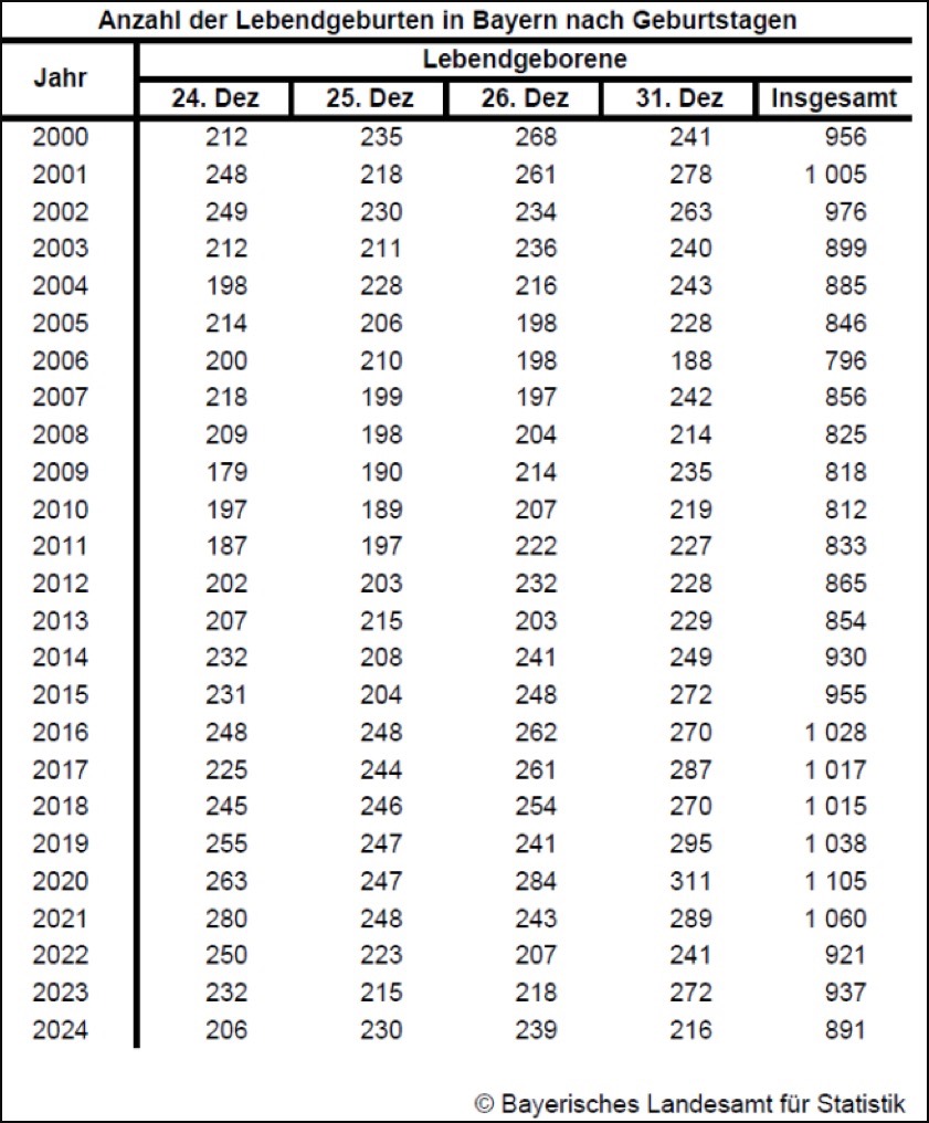 Unter den insgesamt 114 365 im vergangenen Jahr im Freistaat lebend geborenen Kindern gab es, wie eingangs erwähnt insgesamt 206 "Christkinder" – nämlich 113 Buben und 93 Mädchen. Damit war der 24. Dezember im vergangenen Jahr der Tag, an dem in Bayern die wenigsten Kinder geboren wurden (Platz 366 von 366). "Die Neugeborenen-Zahlen an Heiligabend, an den beiden Weihnachts-Feiertagen und am letzten Tag des Jahres liegen in der Regel auf niedrigem Niveau relativ nah beieinander", erklären die Statistik-Fachleute. Am ersten Weihnachts-Feiertag waren es im vergangenen Jahr 230, am zweiten Weihnachts-Feiertag 239.
