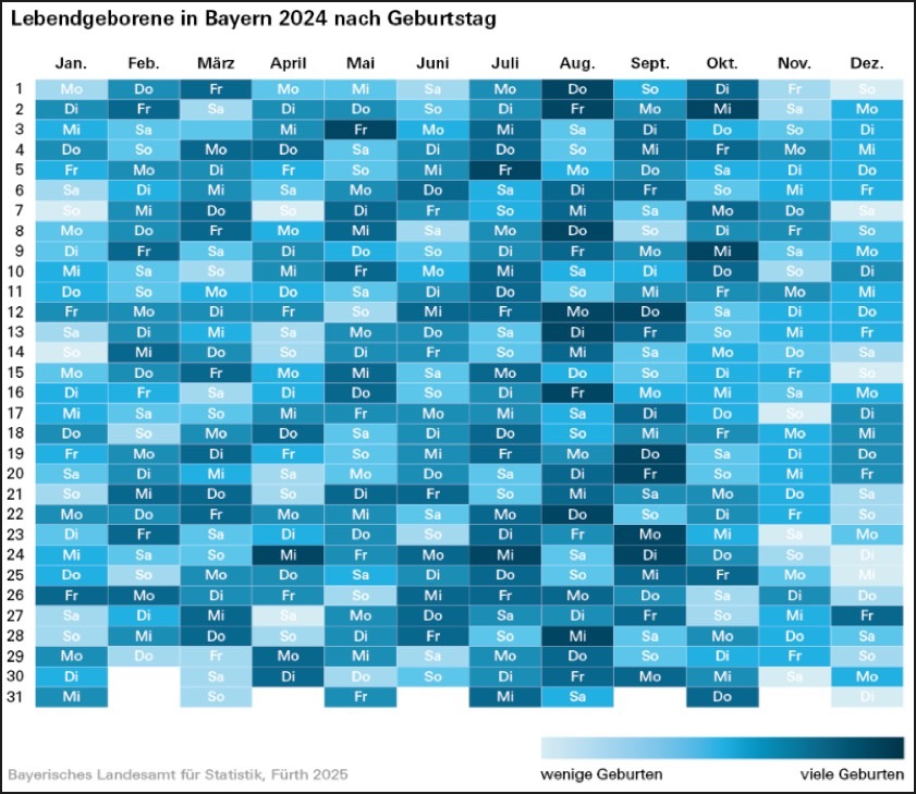 Wie das Landesamt für Statistik weiter mitteilt, wurden im gesamten Dezember vergangenen Jahres im Freistaat 8760 Lebendgeborene verzeichnet, im Durchschnitt also 283 Kinder pro Tag. Der Dezember gelte als ein Monat mit vergleichsweise niedrigen Geburten-Zahlen, während die Sommer-Monate regelmäßig zu den geburtenstärksten Monaten zählten. Die meisten Lebendgeburten des vergangenen Jahres wurden im Juli mit insgesamt 10 472 neuen Erdenbürgern verzeichnet, das entsprach 338 Geburten pro Tag. Der geburtenstärkste Tag war im vergangenen Jahr der 16. August, an dem in Bayern 401 Kinder das Licht der Welt erblickten.