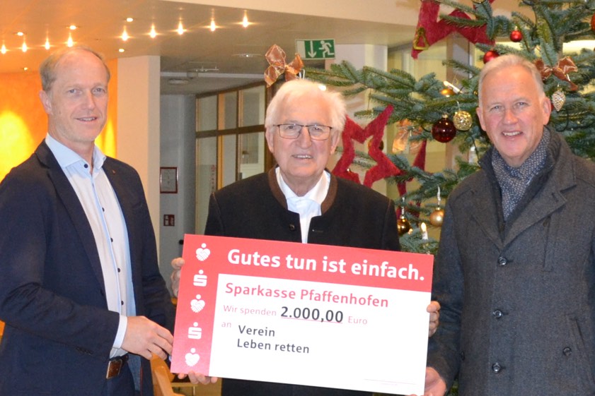 (ty) "Zur Aufrechterhaltung der Notarzt-Versorgung im Landkreis" hat die Stiftung der Sparkasse von Pfaffenhofen einen Betrag in Höhe von 2000 Euro an den hiesigen Verein "Leben retten" gespendet. Der symbolische Scheck wurde von Tino Müller, Vorstands-Vorsitzender der Sparkasse von Pfaffenhofen, und Michael Hoyer, Vorsitzender der Stiftung, an Altlandrat Rudi Engelhard, den Vorsitzenden des Vereins, übergeben (Foto oben).