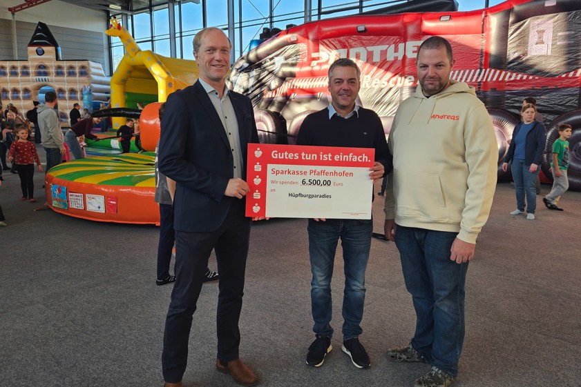 Tino Müller, Vorstands-Vorsitzender der Sparkasse von Pfaffenhofen, überreichte laut Stadtverwaltung anlässlich der Eröffnung des Hüpfburgen-Paradieses am Samstag einen symbolischen Spenden-Scheck über 6500 Euro an Bürgermeister Thomas Herker (SPD). Der Rathaus-Chef bedankte sich den Angaben zufolge für die großzügige finanzielle Unterstützung und richtete seinen Dank für die fantasievollen Spielgeräte ebenfalls an die Hüpfburg-Verleih-Firma "Springhelden-Welt by Eder", die dieses Jahr zum ersten Mal das Event ausstattet.