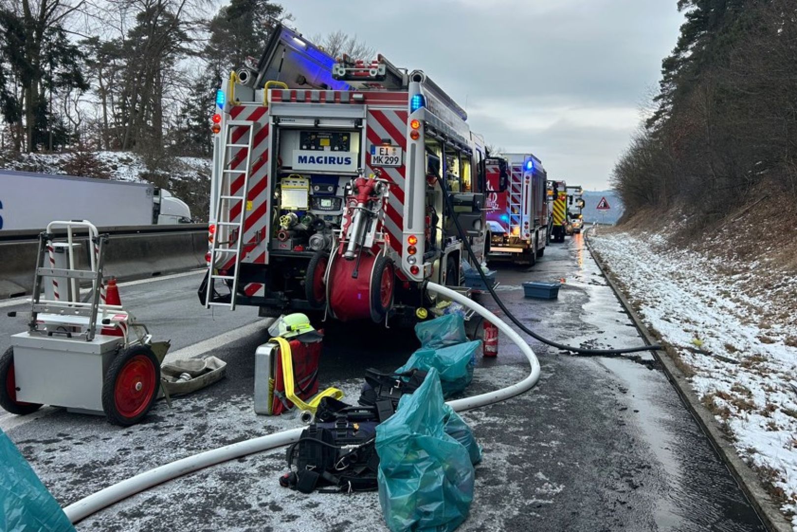 (ty) Ein im Bereich des Kindinger Bergs auf der A9 in Richtung Nürnberg in Flammen geratener Sattelzug-Auflieger hat am heutigen Dienstag nicht nur ein Großaufgebot von Einsatzkräften auf den Plan gerufen, sondern auch für erhebliche Behinderungen gesorgt. Wie die Verkehrspolizei-Inspektion aus Ingolstadt gegen 15.50 Uhr mitgeteilt hat, musste die Autobahn in Richtung Norden wegen der starken Rauch-Entwicklung zeitweise komplett gesperrt werden. Dadurch habe sich ein Rückstau mit einer Länge von ungefähr zwei Kilometern gebildet. Mittlerweile habe die linke Spur wieder freigegeben werden können.