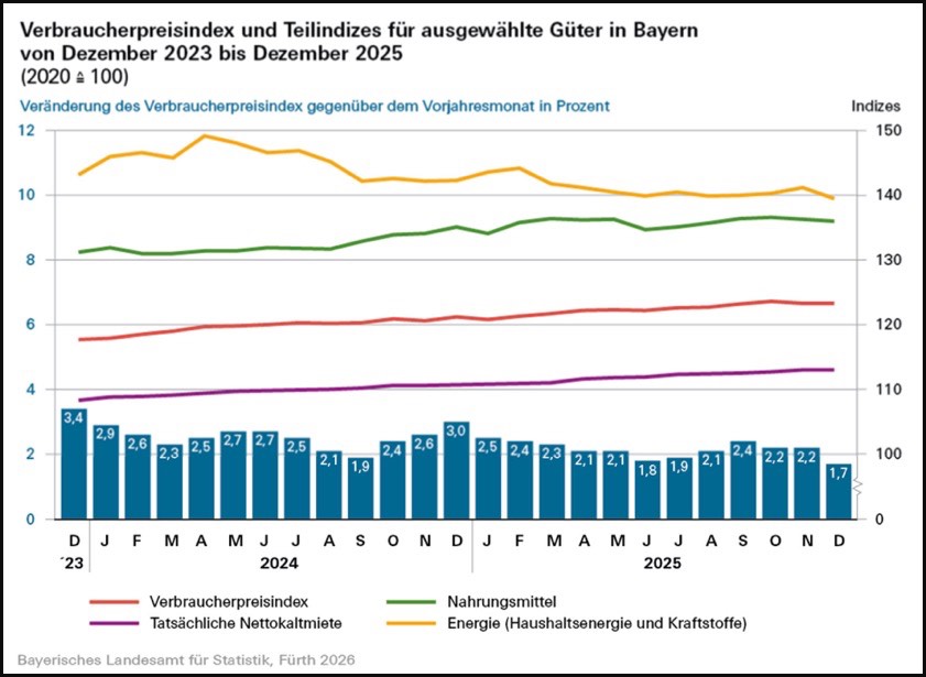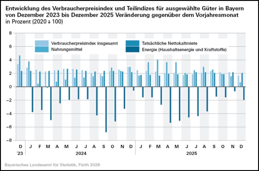 (ty) Im Freistaat sind die Verbraucher-Preise im gerade zu Ende gegangenen Dezember gegenüber dem Vorjahres-Monat um 1,7 Prozent gestiegen. Das wurde am heutigen Mittwoch aus dem bayerischen Landesamt für Statistik gemeldet. Den Angaben der Behörde zufolge kosten Nahrungsmittel damit nun 0,7 Prozent mehr als vor einem Jahr; Energie kann hingegen um 2,0 Prozent günstiger bezogen werden. Im Vergleich zum Vormonat November blieb der Verbraucher-Preis-Index unverändert. Nachfolgend weitere Details – auch zu einzelnen Waren – sowie zwei Grafiken.