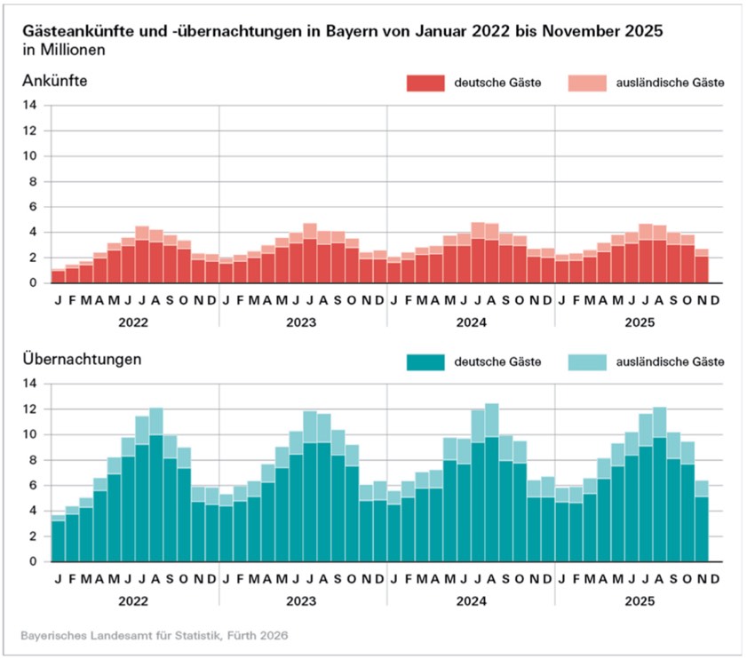 Mit rund 0,6 Millionen sank die Zahl der Gäste aus dem Ausland im November im Vergleich zum Vorjahres-Monat um 1,0 Prozent. Sie übernachteten knapp 1,3 Millionen Mal in einem bayerischen Beherbergungs-Betrieb. Das entspricht einem Rückgang um 4,0 Prozent. Bei Gästen aus Deutschland dagegen schien Bayern als Destination auch in der kalten Jahreszeit beliebt zu sein. Für diese Gruppe wurde ein leichter Zuwachs von 0,7 Prozent bei den Ankünften (2,1 Millionen) und 0,6 Prozent bei den Übernachtungen (5,1 Millionen) registriert.