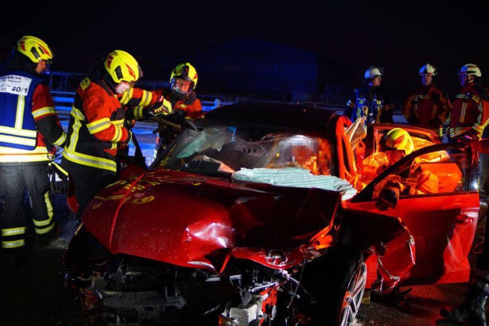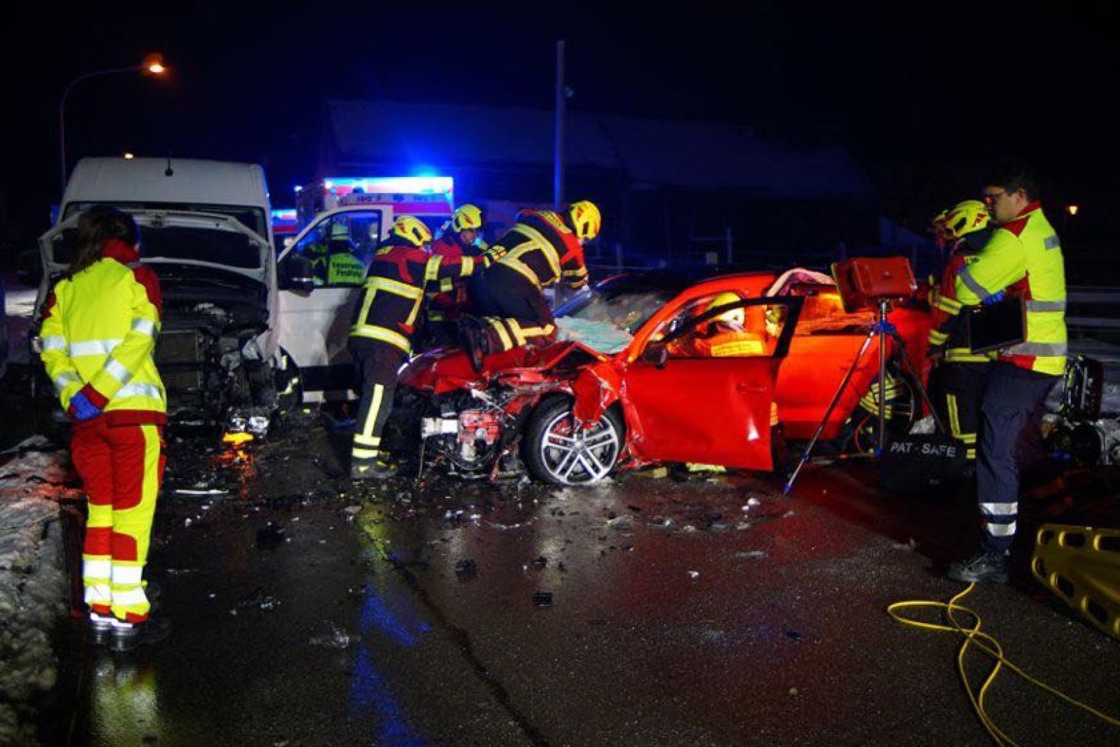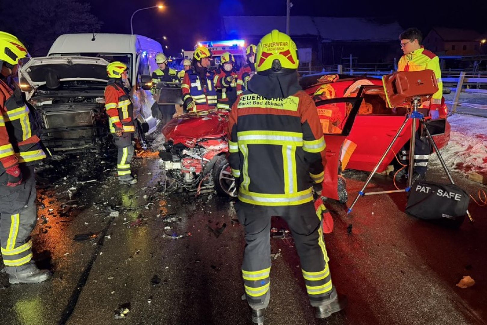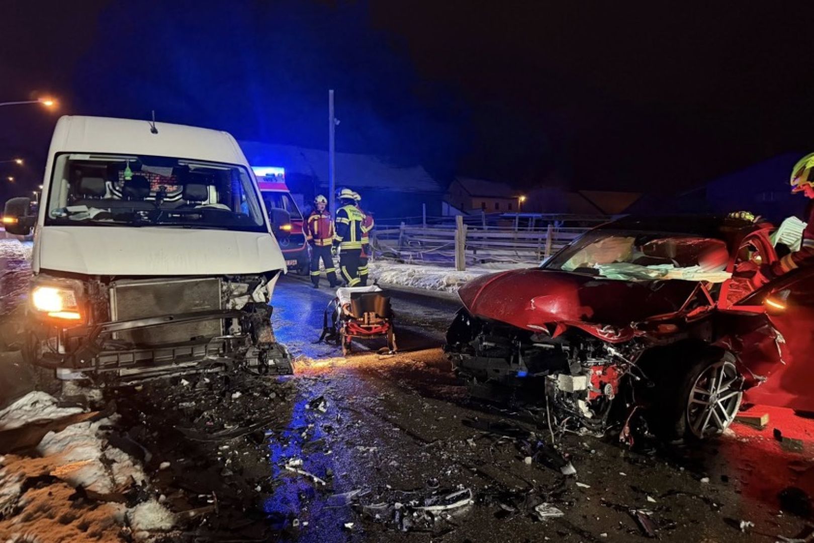 Laut Polizei war der 40 Jahre alte Rumäne mit seinem Auto auf der Kreisstraße R4 – von Bad Abbach her kommend – in Richtung Seedorf unterwegs. In der Ortschaft sei er mit seinem Pkw nach rechts von der Strecke geraten und habe zirka 100 Meter im gefrorenen Grünstreifen zurückgelegt; dabei sei auch der Zaun einer Pferdekoppel ramponiert worden. Bei dem Versuch, seinen Wagen wieder auf die Fahrbahn zu steuern, sei dieser auf die Gegenspur geraten und frontal mit dem entgegenkommenden Kleintransporter zusammenstoßen, in dem sich die beiden Deutschen befanden. Durch die Wucht des Aufpralls sei der Unfall-Verursacher schwer verletzt und in seinem Wrack eingeklemmt worden.