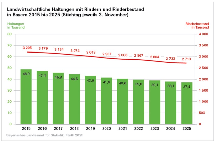 Den größten Anteil am gesamten bayerischen Rinder-Bestand hatten zum Stichtag mit 38,0 Prozent weiterhin die Milchkühe mit insgesamt 1 030 887 Tieren. Dieser Bestand blieb im Vergleich zum Vorjahr mit einem Minus von 0,5 Prozent (5 199 Tiere weniger) nahezu unverändert. Dem allgemeinen Trend in der Landwirtschaft folgend, ging die Zahl der Milchkuh-Haltungen mit einem Minus von 3,5 Prozent (779 Haltungen weniger) stärker zurück als der Bestand an Tieren. Damit zählte der Freistaat zum Stichtag insgesamt 21 676 Milchkuh-Haltungen. Höhere Rückgänge waren bei den Beständen von Rindern im Alter von mindestens zwei Jahren zu verzeichnen; hier nahmen die Bestände um 3,0 Prozent auf 195 629 Tiere ab.