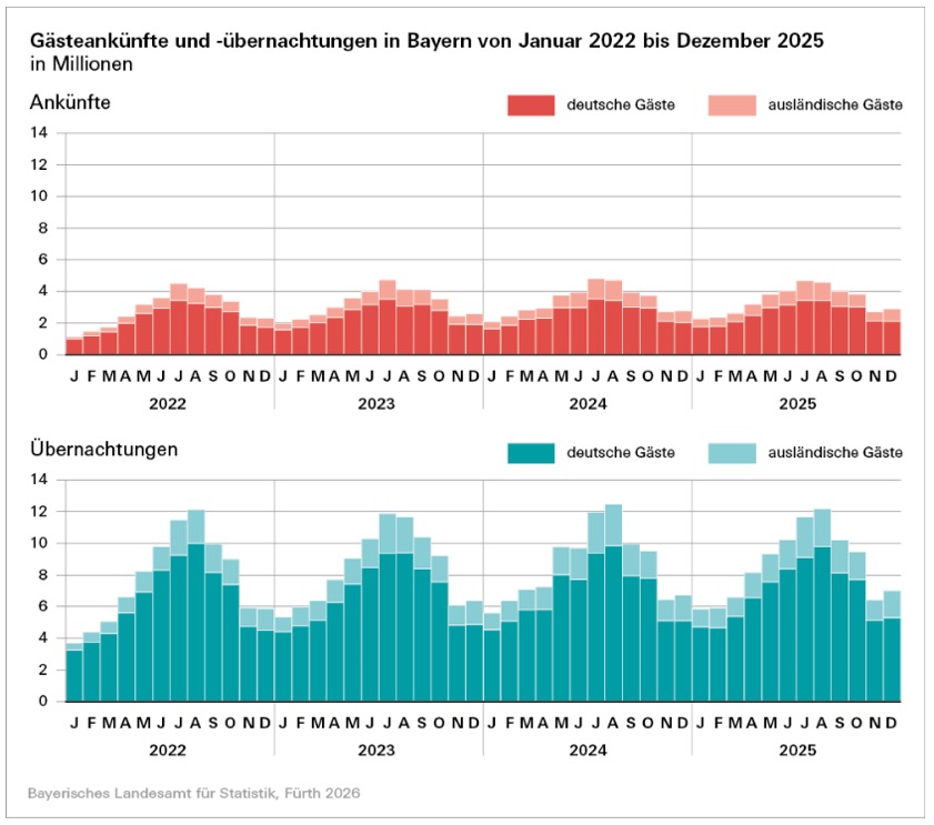 Bayerns Popularität bei inländischen Gästen, also bei Gästen mit Wohnsitz in Deutschland, blieb ungebrochen. Mit über 31,3 Millionen Gäste-Ankünften und rund 82,3 Millionen Übernachtungen wurde das bisherige Rekord-Niveau aus dem Jahr 2024 (Ankünfte: 31,0 Millionen, Übernachtungen: 82,0 Millionen) übertroffen. Gleichzeitig blieb die Anzahl internationaler Gäste mit gut 9,6 Millionen konstant, während deren Übernachtungen um 0,8 Prozent auf 20,6 Millionen zurückgingen.