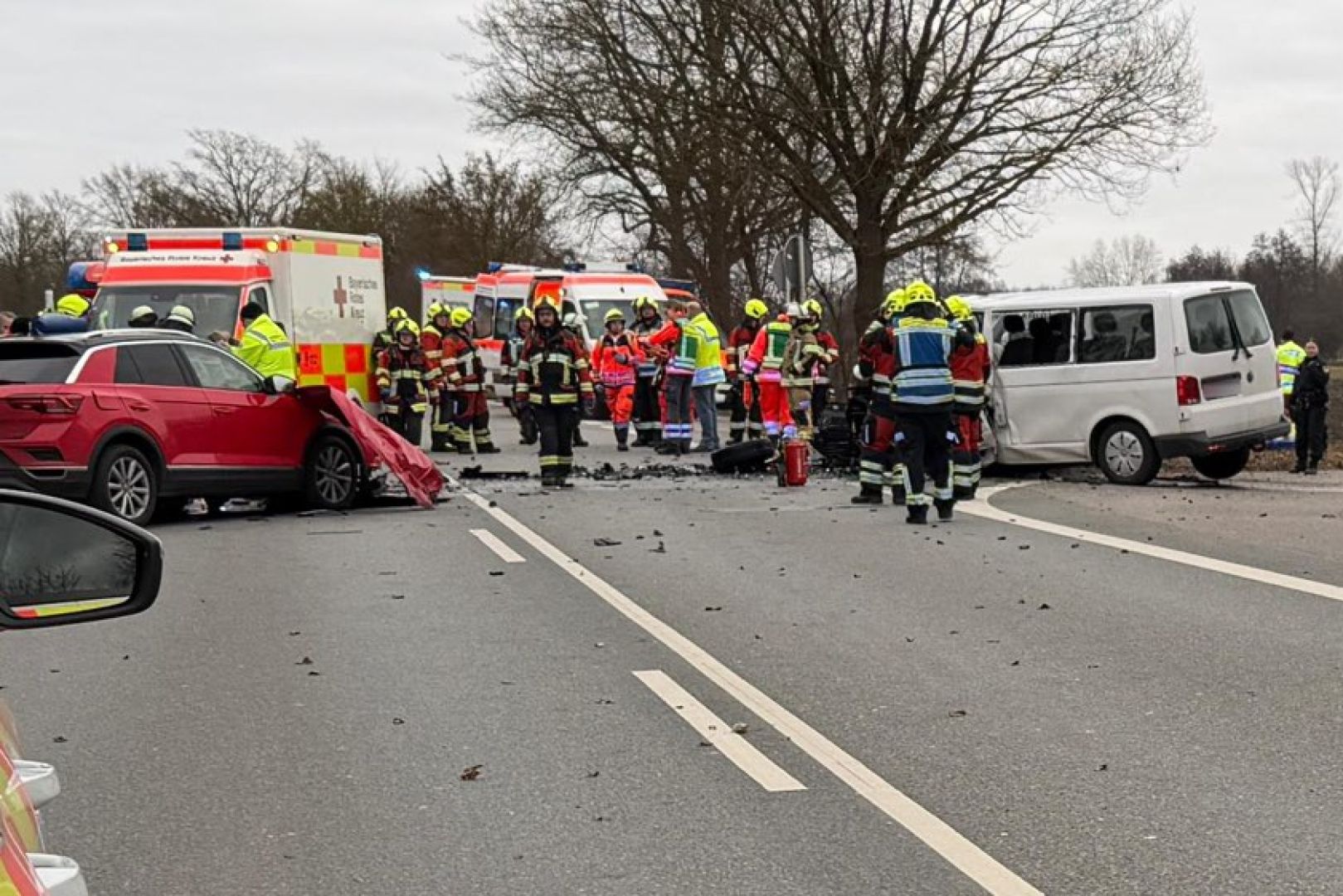 Wie die Verkehrspolizei-Inspektion aus Ingolstadt heute berichtet, war ein 68 Jahre alter Ingolstädter mit seinem T-Roc auf der Bundesstraße in Richtung Neuburg an der Donau unterwegs, während sich ein 38 Jahre alter Harburger mit seinem VW-Kleinbus im Gegenverkehr befand. Der Kleinbus sei mit einer Betreuerin und einem Betreuer sowie fünf Jugendlichen einer Jugend-Wohngruppe aus Neuburg an der Donau besetzt gewesen. Auf Höhe der Einmündung nach Manching sei der T-Roc nach links geraten und frontal mit dem Kleinbus kollidiert.