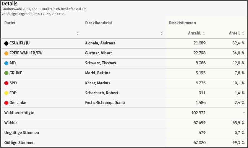 Der Amtsinhaber von den Freien Wählern holte heute 34,0 Prozent – knapp dahinter landete der CSU-Kandidat mit 32,4 Prozent.