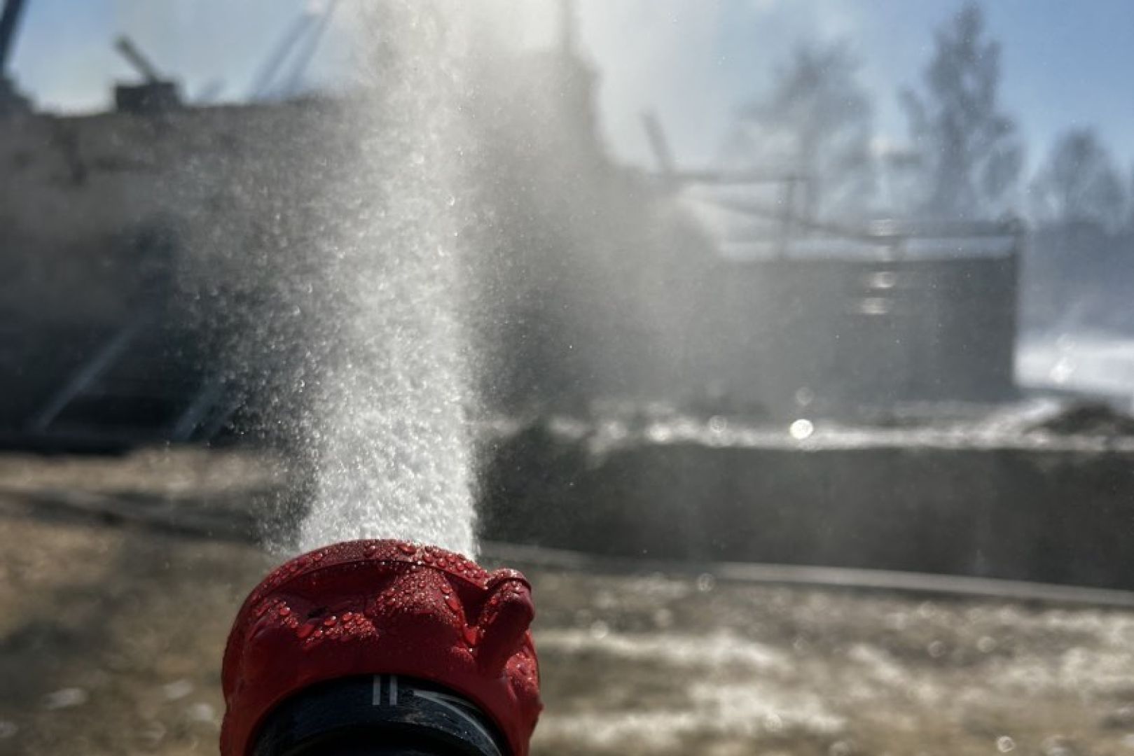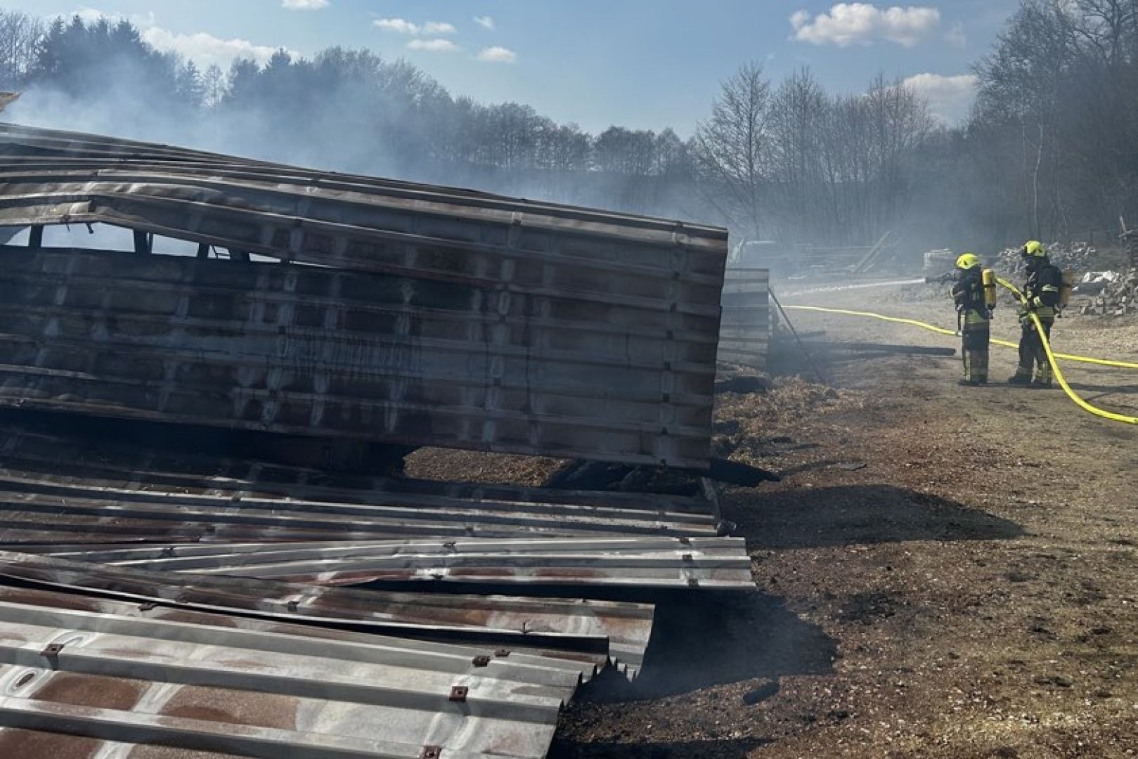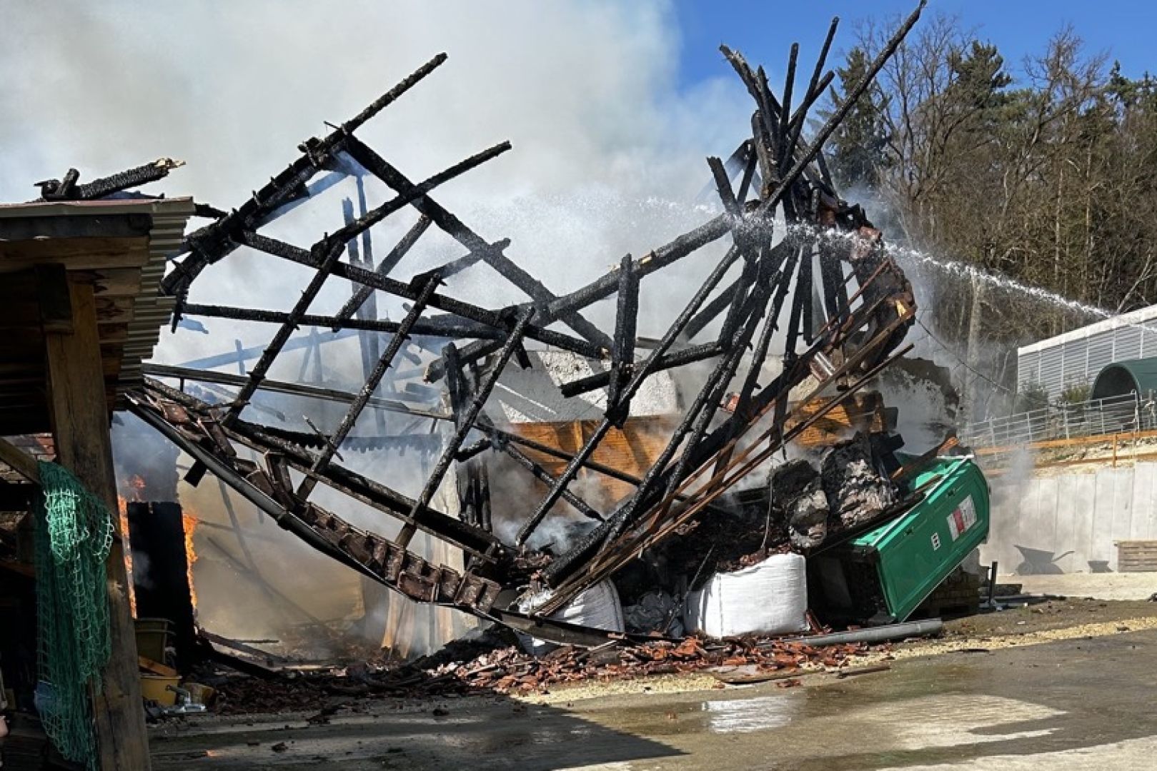 "Bereits auf der Anfahrt war die schwarze Rauchsäule deutlich zu erkennen und die Atemschutz-Trupps rüsteten sich aus",  erklärt die Feuerwehr aus Train. "Beim Eintreffen an der Einsatzstelle stand die Scheune bereits im Vollbrand, sodass unsere Atemschutzgeräte-Träger unmittelbar nach Aufbau der Wasser-Versorgung bei dem Lösch-Angriff unterstützten." Zur Sicherstellung der Versorgung seien teils lange Schlauch-Strecken erforderlich gewesen, um Löschwasser aus der Abens zum Brandort zu pumpen.