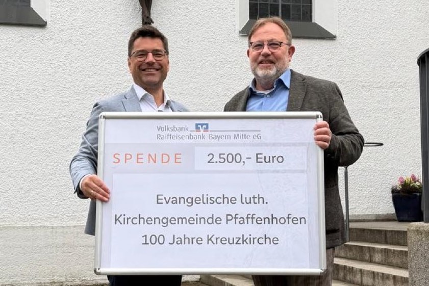 (ty) Anlässlich des Jubiläums "100 Jahre Kreuzkirche Pfaffenhofen" hat die Volksbank-Raiffeisenbank Bayern-Mitte eine Spende in Höhe von 2500 Euro überreicht. Die Übergabe erfolgte vor Ort durch Andreas Streb, den Vorstands-Vorsitzenden des Geldinstituts. Entgegengenommen wurde der symbolische Scheck von George Spanos, Pfarrer der evangelisch-lutherischen Kirchen-Gemeinde in der Kreisstadt (Foto oben).