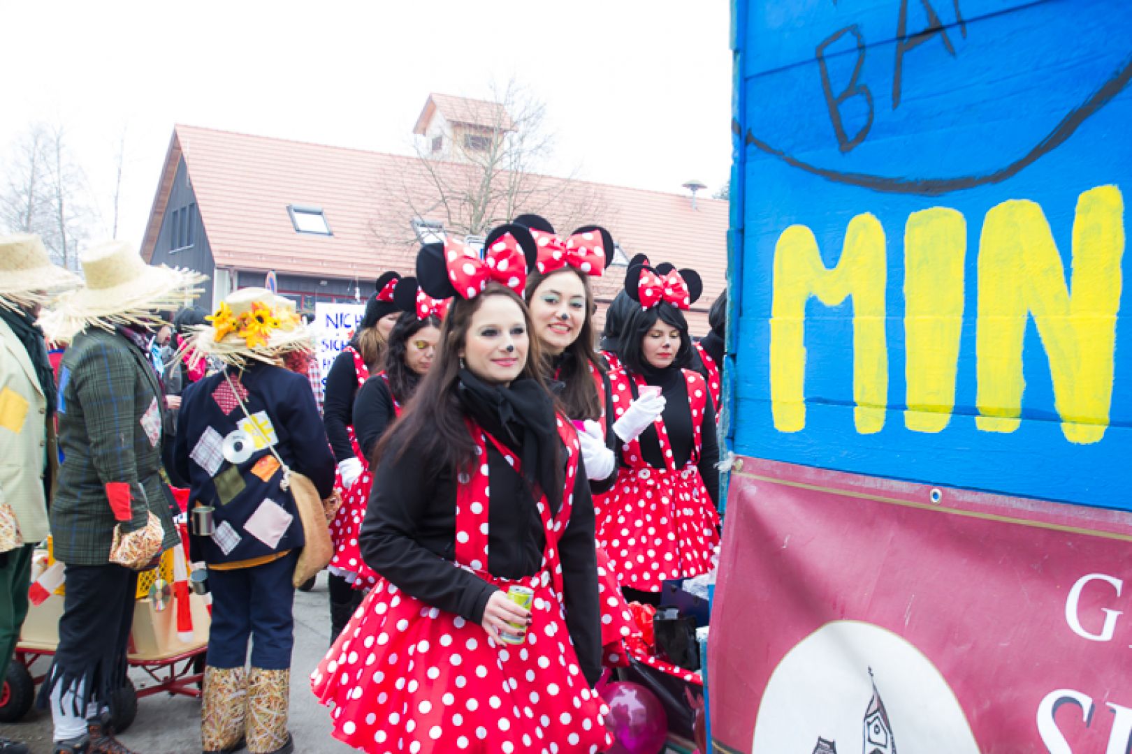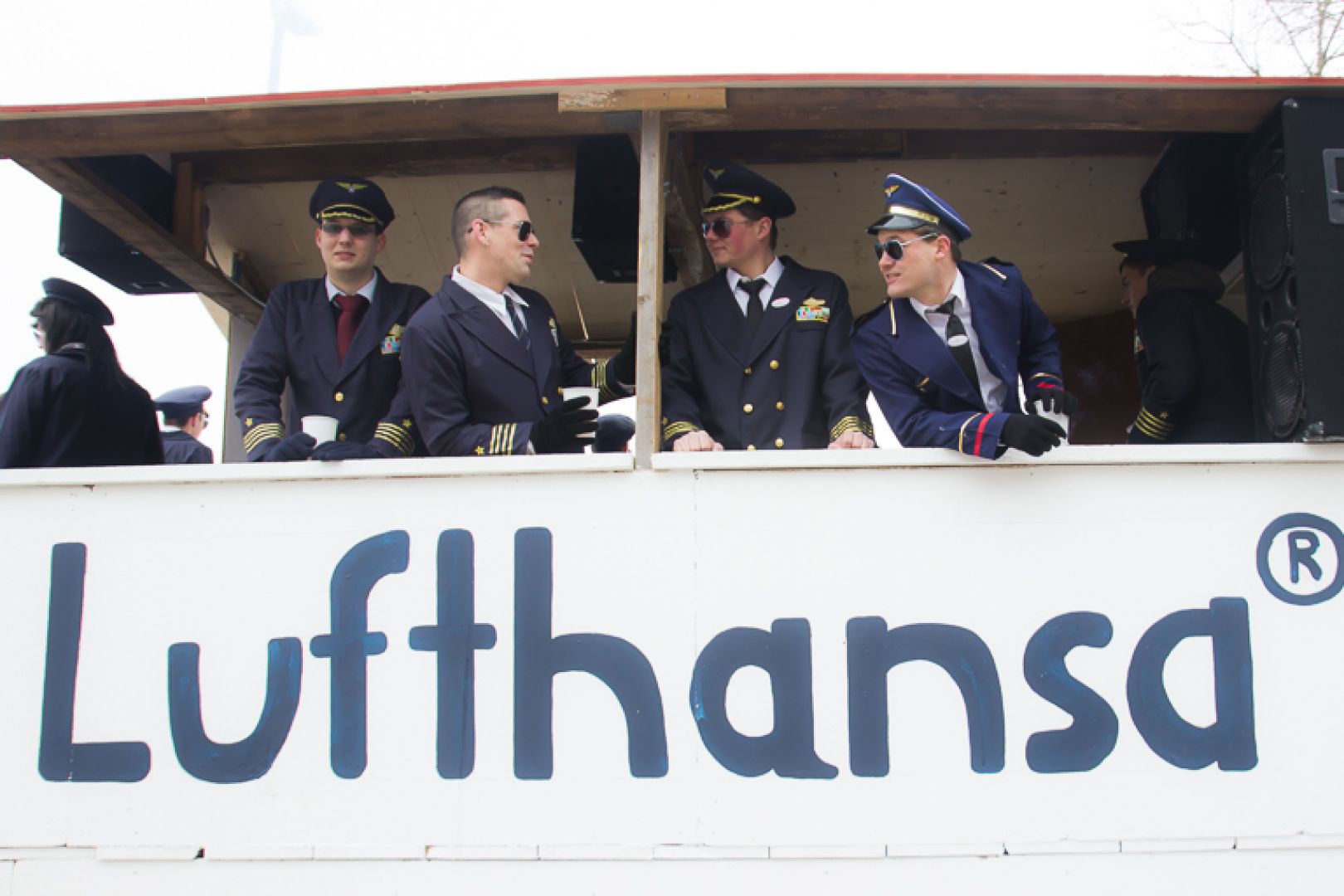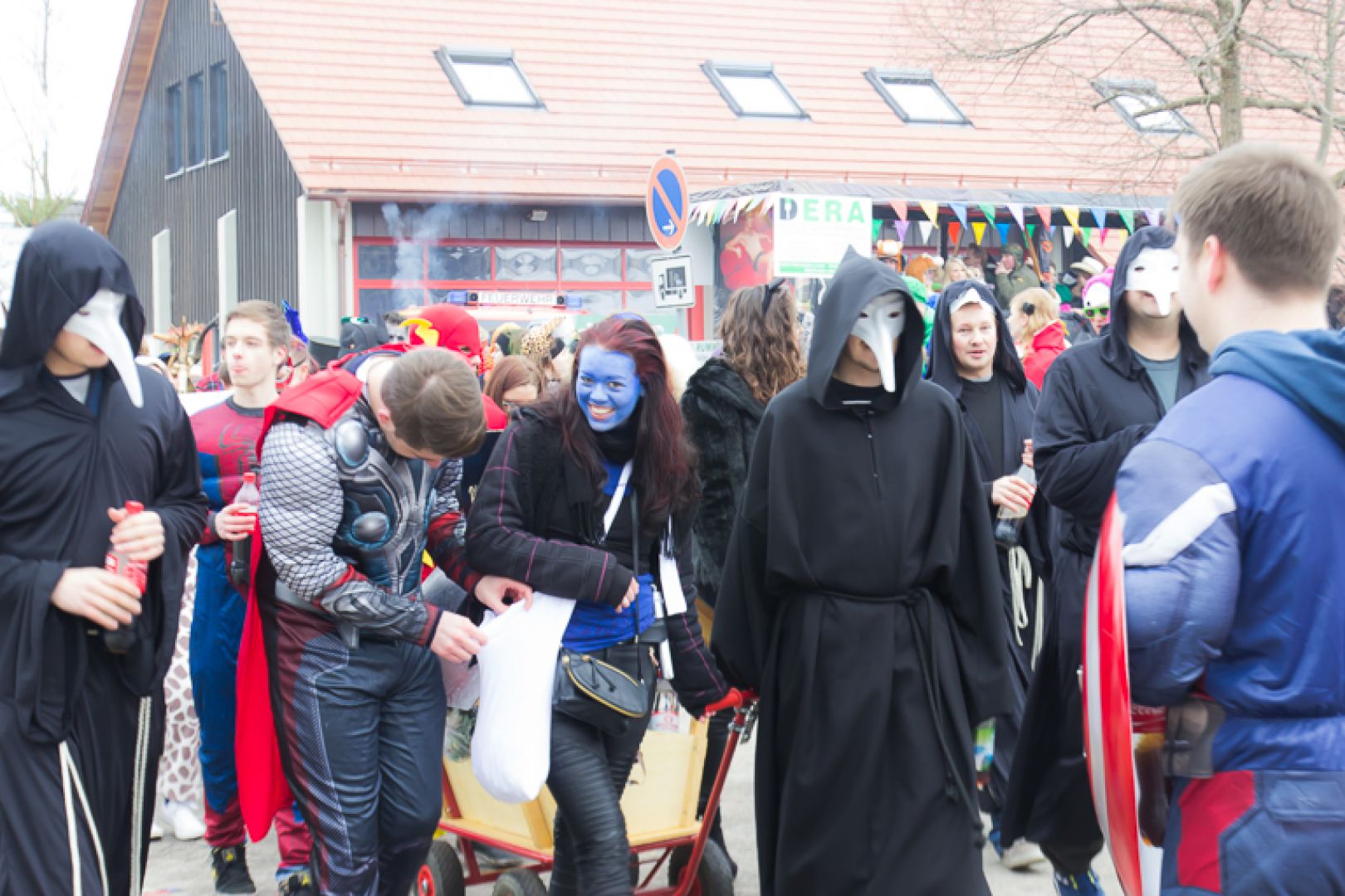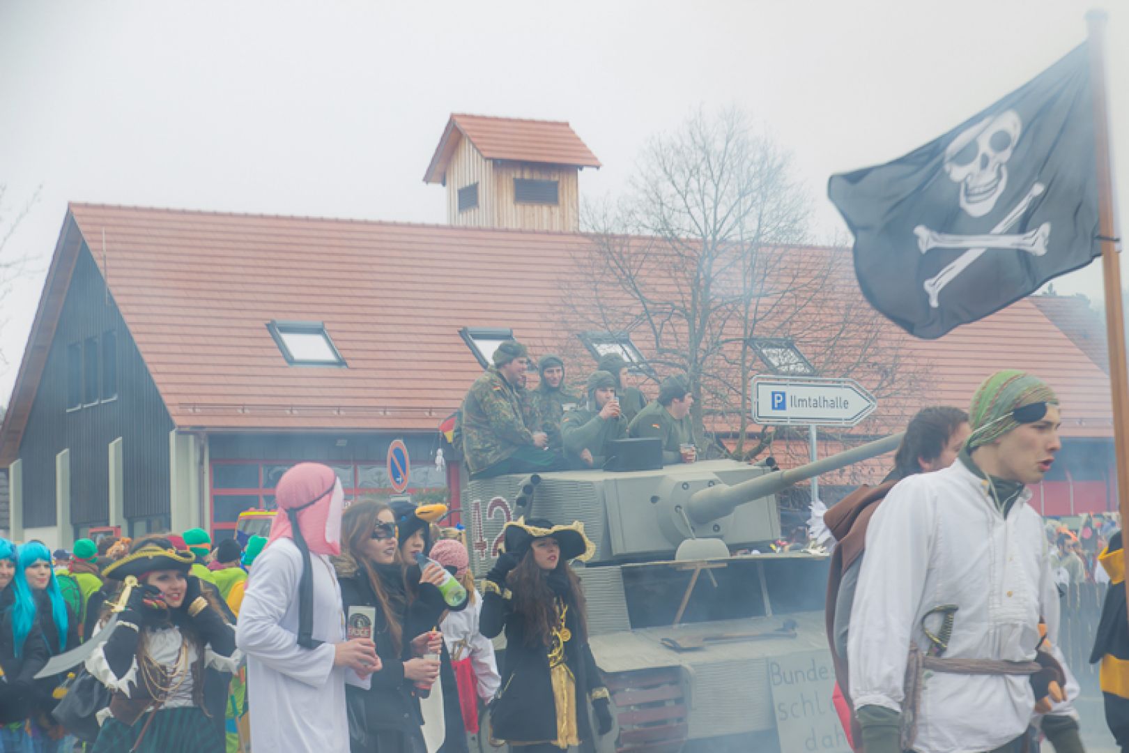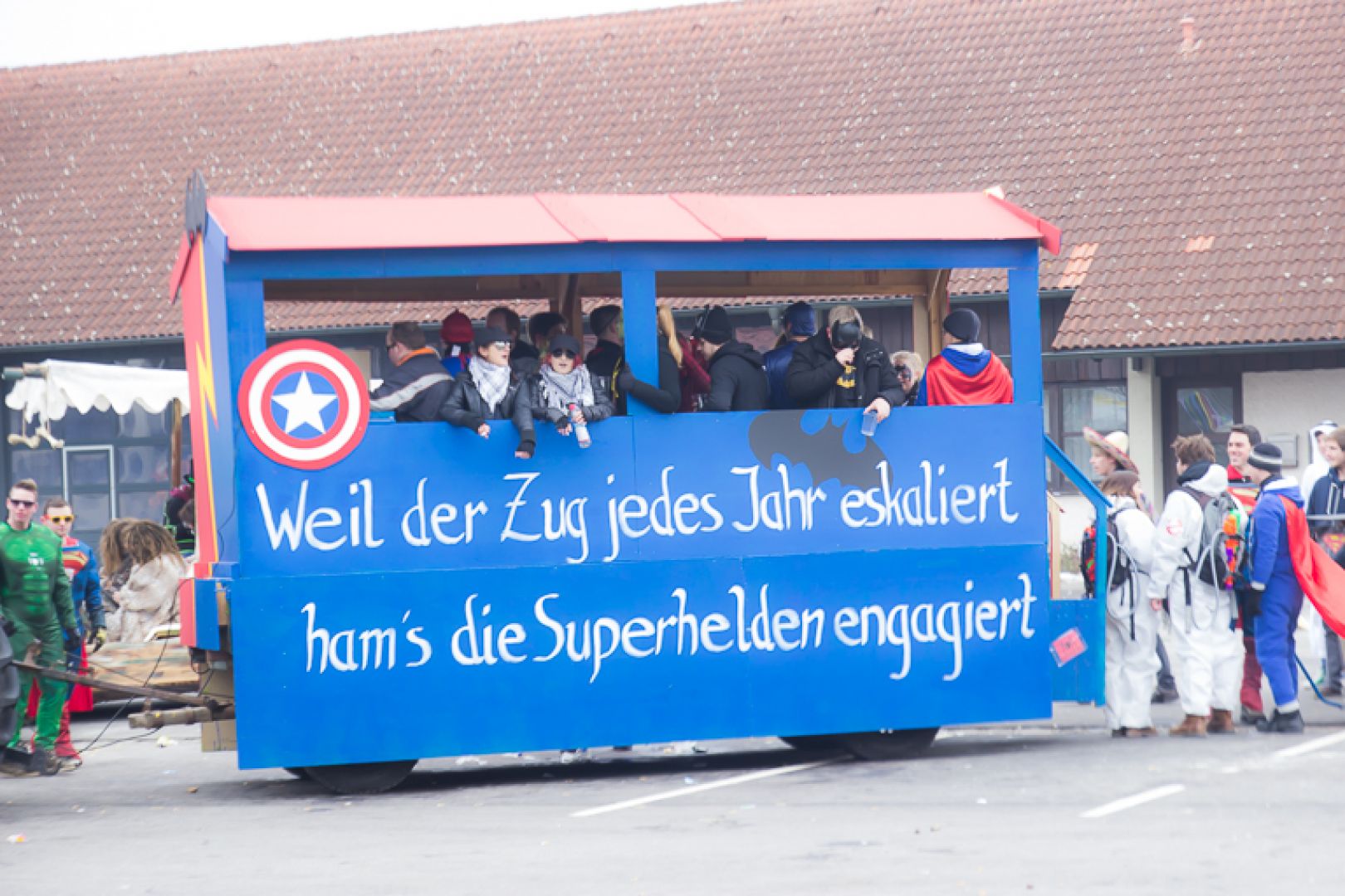 Die Motivwagen nahmen Lufthansa und die Streiks aufs Korn, ein fahrender Kinderspielplatz freute sich hämisch, dass heimische Kinder nicht länger unter „Bodenhaltung“ zu leiden hätten und furchterregende Perchten versprachen das Rathaus zu stürmen, um den Dauerstreit zu schlichten. Durstige Superhelden rollten an, um Saufgelage und „Eskalationen“ zu verhindern. Blaue Radler versuchten im Achter-Tretmobil auf Kurs zu bleiben und die „Bundeswehr schlich daher“: Ein Panzerstoßtrupp rollte auf leisen Sohlen durch die Menge: Der Papp-Leopard war mit Fliesenkleber zusammengeleimt. Unter dem Geschützturm sorgte ein schrottreifer VW-Golf für den eher geruhsamen Vortrieb.