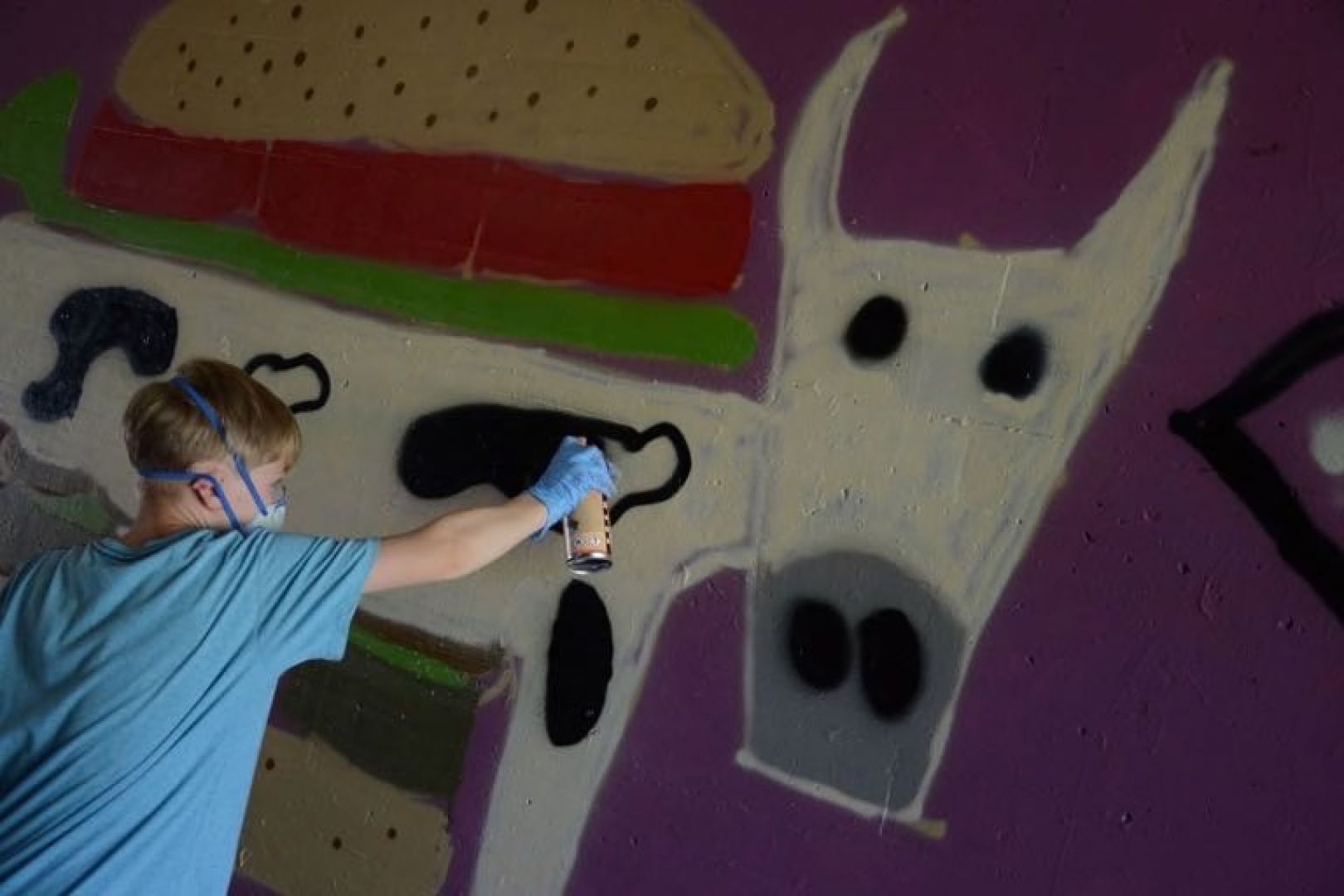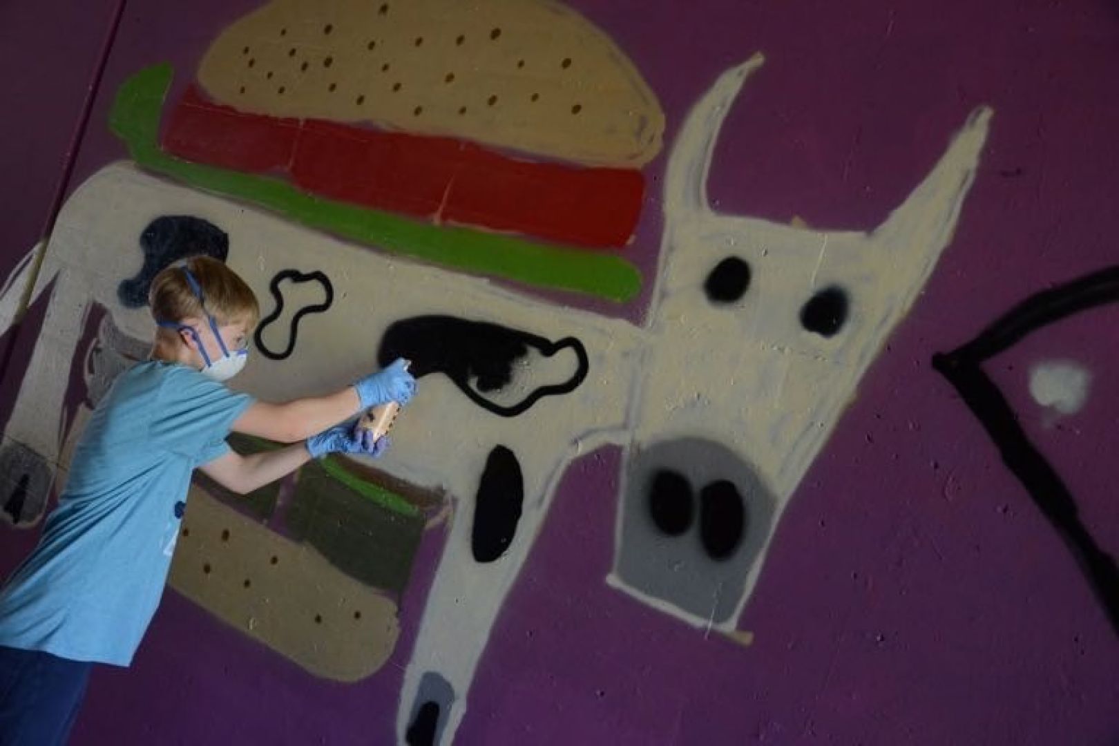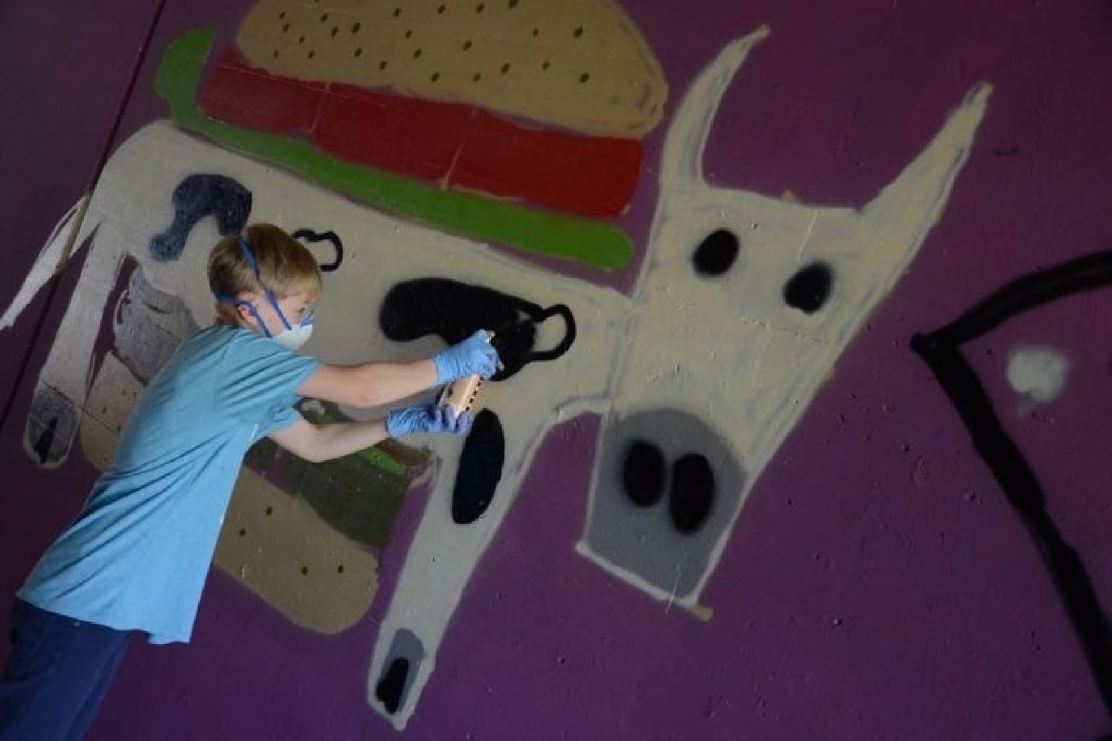 Dann wurden die Umrisse der erdachten und im Kleinen skizzierten Motive großformatig auf die Wände übertragen. Und der heutige Tag stand vor allem im Zeichen der künstlerischen Umsetzung. Dill beriet, zeigte, unterstützte und gab Tipps. „Jeder bekommt so viel Hilfestellung und Anleitung wie er braucht“, sagt er. Die konstruktive Kritik werde dem jeweiligen Niveau angepasst. Die Teilnahme-Gebühr für den zweitätigen Workshop beträgt übrigens 25 Euro; Farbdosen sind im Preis inbegriffen. Getränke auch.