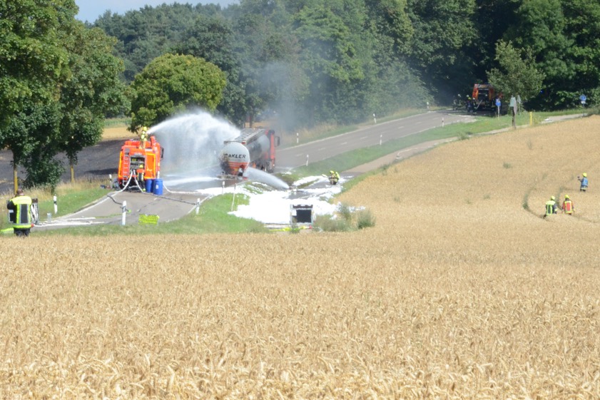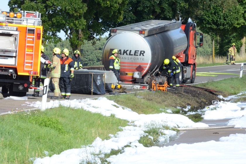 Nachdem die Feuerwehrleute den brennenden Tankzug gelöscht hatten, wurde er weiter abgekühlt. Noch am heutigen Abend soll eine Spezialfirma anrücken, um die Ladung umzupumpen. Wann diese Maßnahme starten kann, ist zur Stunde noch unklar. Denn gegen 17.45 Uhr wurde festgestellt, dass der Tankzug nach dem Abkühlen undicht geworden war. „Die Feuerwehr hat die Situation aber unter Kontrolle“, sagte ein Polizei-Sprecher gegen 19.45 Uhr auf Anfrage unserer Redaktion. Es seien entsprechende Maßnahmen ergriffen, um den auslaufenden Sprit gezielt aufzufangen.