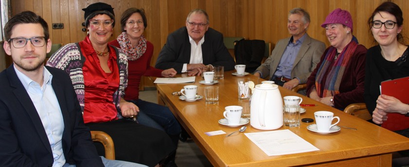 Austausch zur Integration in Hohenwart: Rathaus-Geschäftsführer Felix Kluck (von links), Renate Muhr (Ansprechpartnerin für Asyl in der Gemeinde, hier im Faschings-Outfit wegen des Unsinniges Donnerstags) Helferkreis-Sprecherin Monika Mulock, Bürgermeister Manfred Russer (CSU), die Ehrenamtlichen Johann Lichey und Uta Klawitter sowie Christine Pietsch, die Leiterin des neuen Sachgebiets "Integration" am Landratsamt.