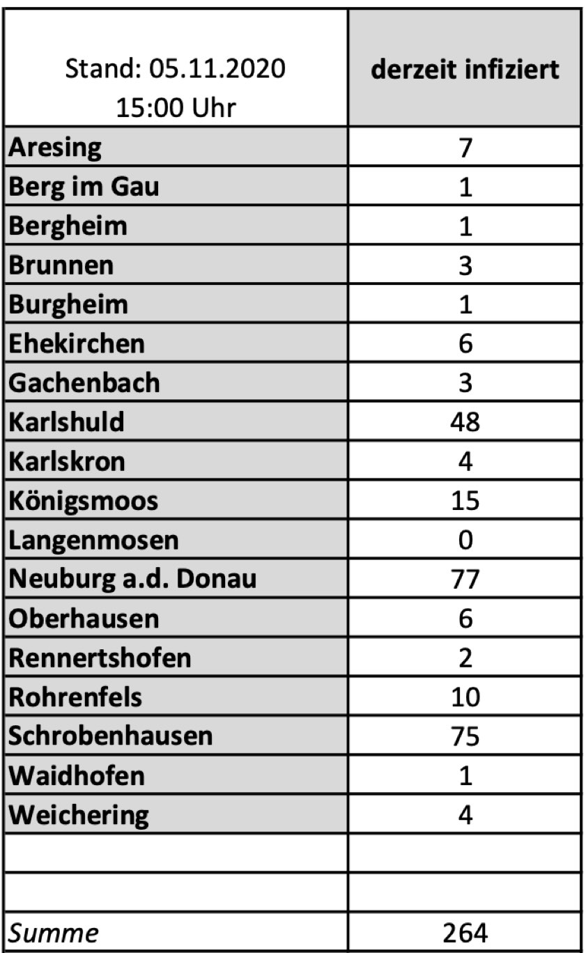 (ty) Die Corona-Lage im Kreis Neuburg-Schrobenhausen stellt sich laut aktueller Mitteilung aus dem Landratsamt wie folgt dar: Bislang – Stand: heute, 13 Uhr – wurden 907 Landkreis-Bürger positiv auf den neuartigen Erreger getestet. Die Zahl hat sich seit der gestrigen Meldung um 22 erhöht. Von den Infizierten gelten mittlerweile 625 als genesen – unverändert seit gestern. 18 Personen, die positiv auf das Virus getestet worden waren, sind gestorben. Damit gibt es momentan 264 aktive Corona-Fälle (gestern: 242) im Landkreis. Zahlen aus den Gemeinden zeigt die Tabelle unten.