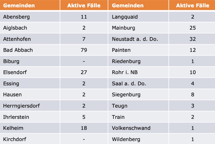 (ty) Im Kreis Kelheim gibt es in Zusammenhang mit der Corona-Pandemie, wie berichtet, mittlerweile 57 Menschenleben zu beklagen. Unter Verweis auf Daten des Gesundheitsamts teilte das Landratsamt heute mit, dass – Stand gestern, 16 Uhr – die Zahl der im Kreis Kelheim positiv auf den neuartigen Erreger getesteten Menschen bei insgesamt 2731 liegt – das sind 49 mehr als gestern gemeldet. 2418 hiesige Corona-Patienten (gestern: 2392) gelten mittlerweile als genesen und sind aus der Quarantäne entlassen. Derzeit gibt es 256 aktive Corona-Fälle im Landkreis (gestern: 233). Zahlen aus den einzelnen Gemeinden zeigt die Tabelle unten.