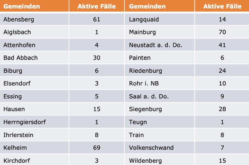 (ty) Im Kreis Kelheim gibt es in Zusammenhang mit der Corona-Pandemie vier weitere Menschenleben zu beklagen. Wie das Landratsamt heute mitteilte, sind drei mit dem Erreger infizierte Männer (Jahrgang 1929, 1932, 1933) mit Vorerkrankungen und ein infizierter Mann (Jahrgang 1950) ohne Vorerkrankungen gestorben. Damit erhöht sich die Zahl der Landkreis-Bürger, die gestorben sind, auf 93. Unter Verweis auf Daten des Gesundheitsamts teilte das Landratsamt heute mit, dass – Stand gestern, 16 Uhr – die Zahl der im Kreis Kelheim positiv auf den neuartigen Erreger getesteten Menschen bei insgesamt 4781 liegt – das sind 65 mehr als gestern gemeldet. Insgesamt 4249 hiesige Corona-Patienten (gestern: 4205) gelten mittlerweile als genesen und sind aus der Quarantäne entlassen. Derzeit gebe es 439 aktive Corona-Fälle (gestern: 422) im Landkreis. Zahlen aus den einzelnen Gemeinden zeigt die Tabelle unten. Angesichts der hohen Inzidenz-Werte gelten seit 20. März wegen der Corona-Notbremse wieder die strengen Regeln wie vor dem 8. März – darunter eine nächtliche Ausgangssperre.