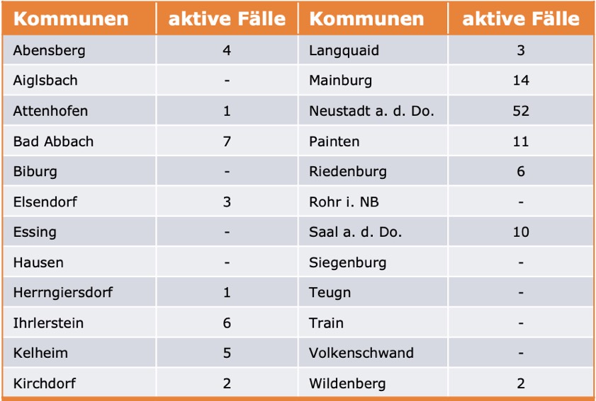 (ty) Im Kreis Kelheim gibt es in Zusammenhang mit der Corona-Pandemie, wie berichtet, mittlerweile 112 Menschenleben zu beklagen. Die weitere Situation stellt sich wie folgt dar: Unter Verweis auf Daten des Gesundheitsamts teilte das Landratsamt heute mit, dass – Stand gestern, 16 Uhr – die Zahl der im Kreis Kelheim positiv auf den neuartigen Erreger getesteten Menschen bei insgesamt 7018 liegt: Das sind 26 mehr als gestern gemeldet. Insgesamt 6779 hiesige Corona-Patienten wurden wieder aus der Quarantäne entlassen und gelten als genesen (gestern: 6773). Derzeit gebe es 127 aktive Corona-Fälle im Landkreis (gestern: 107). Zahlen aus den einzelnen Gemeinden zeigt die Tabelle unten. Seit 2. September gelten bayernweit völlig neue Corona-Regeln (Details siehe unten).
