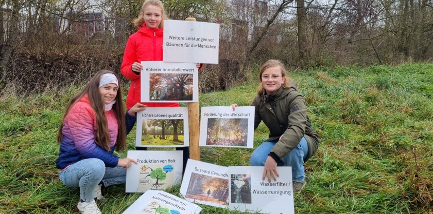 Unter dem Motto "Warum sind Bäume in der Stadt wichtig?" erklärte Mario Dietrich, oberster Gärtner bei den Stadtwerken, den Teenagern wichtige Ökosystem-Leistungen von Bäumen. Mit Hilfe eines Frage-Antwort-Spiels rund um Klimaschutz, Klimawandel-Anpassung, Schutz der Artenvielfalt und "Leistungen von Bäumen für die Menschen" wurde den Schülern die soziale, ökonomische und ökologische Bedeutung von Bäumen nähergebracht. Im Anschluss lernten sie, wie man einen Jungbaum zuschneiden muss, wie ein Baum angebunden und wie die richtige Tiefe eines Pflanzlochs ermittelt wird. Mit geeinten Kräften wurde dann die Silberweide eingepflanzt.