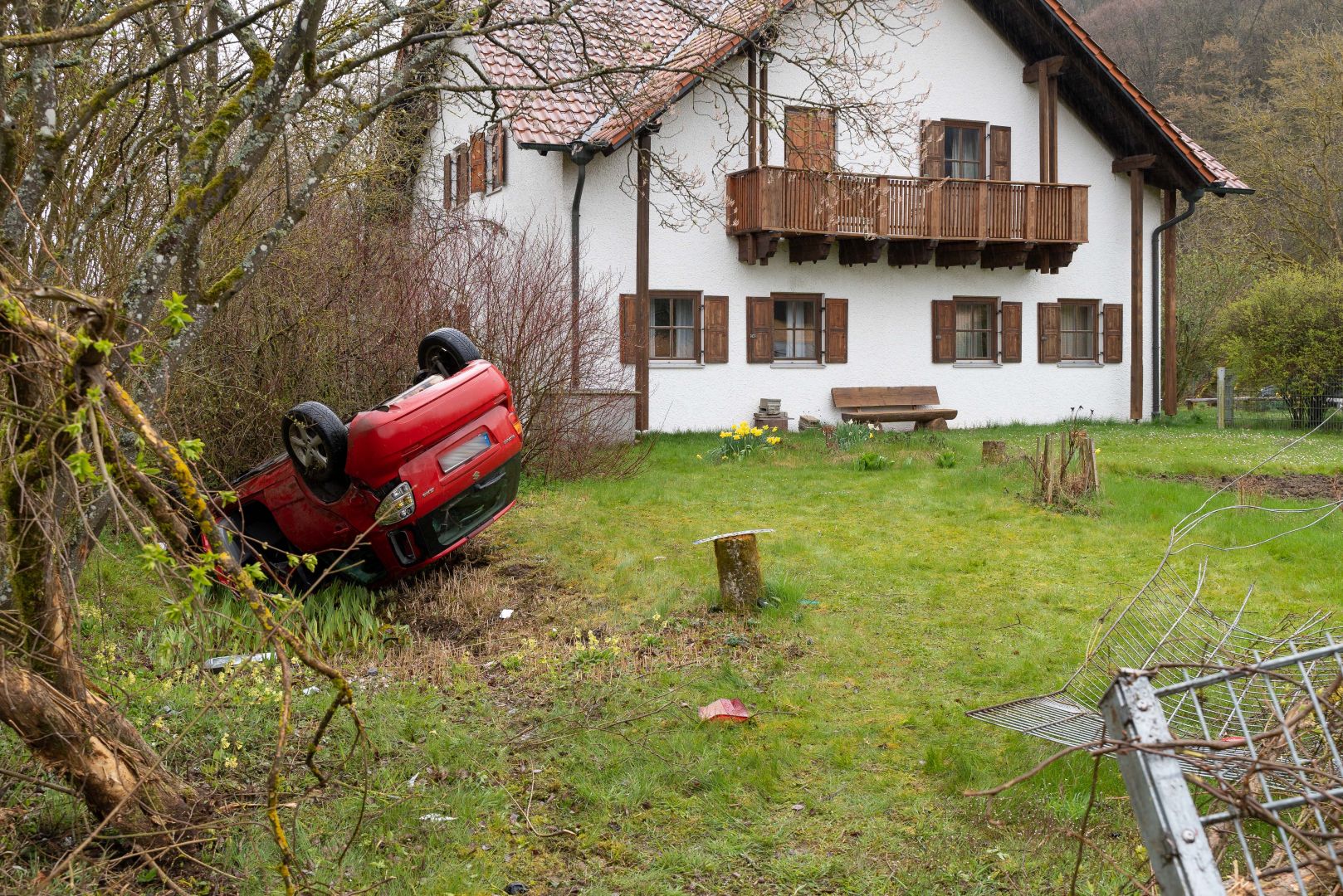 Das Auto sei zunächst nach rechts von dem Weg abgekommen und dann gegen einen Gartenzaun gekracht. Nach einem Überschlag sei das Wrack auf dem Dach in dem Grundstück zum Liegen gekommen. Die beiden Verunglückten konnten sich nach Angaben der Polizei selbstständig aus dem Wagen befreien. Einer der beiden habe zwar versucht, von der Unglücksstelle zu flüchten. Von den wenig später eingetroffenen Streifenbeamten sei er jedoch ausfindig gemacht und vorläufig festgenommen worden. Sowohl der 66-Jährige als auch der 44-Jährige trugen laut Polizei jeweils leichte Verletzungen davon; beide wurden vom Rettungsdienst vorsorglich ins Krankenhaus nach Kelheim gebracht.