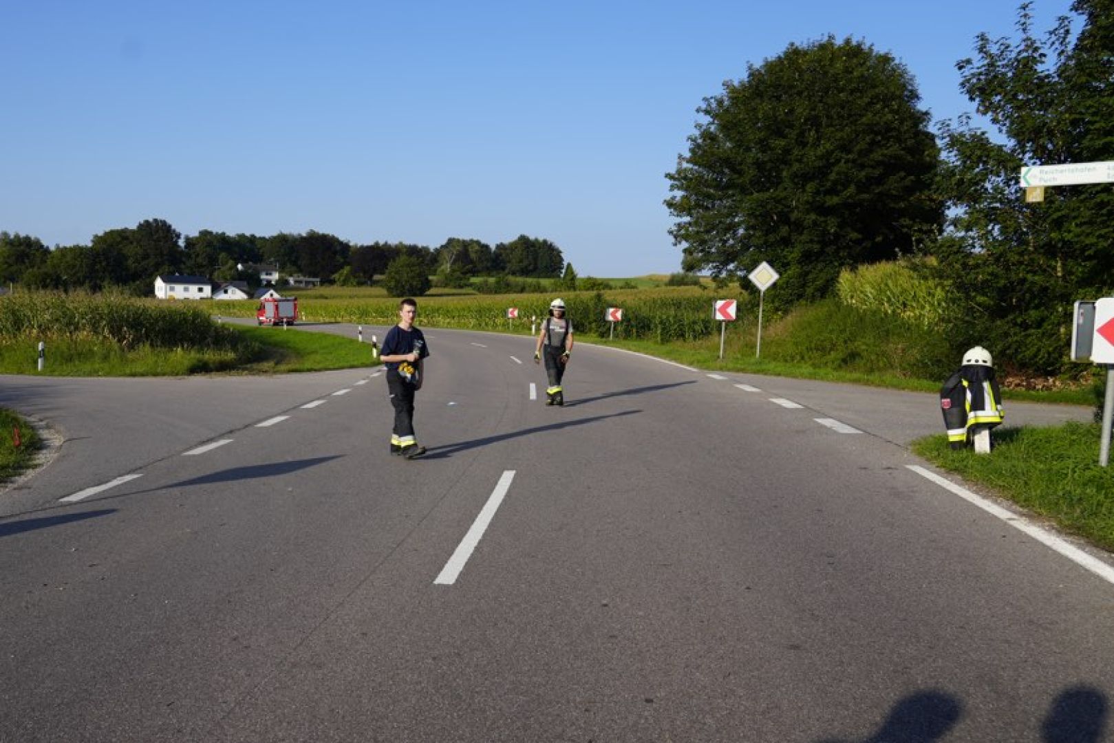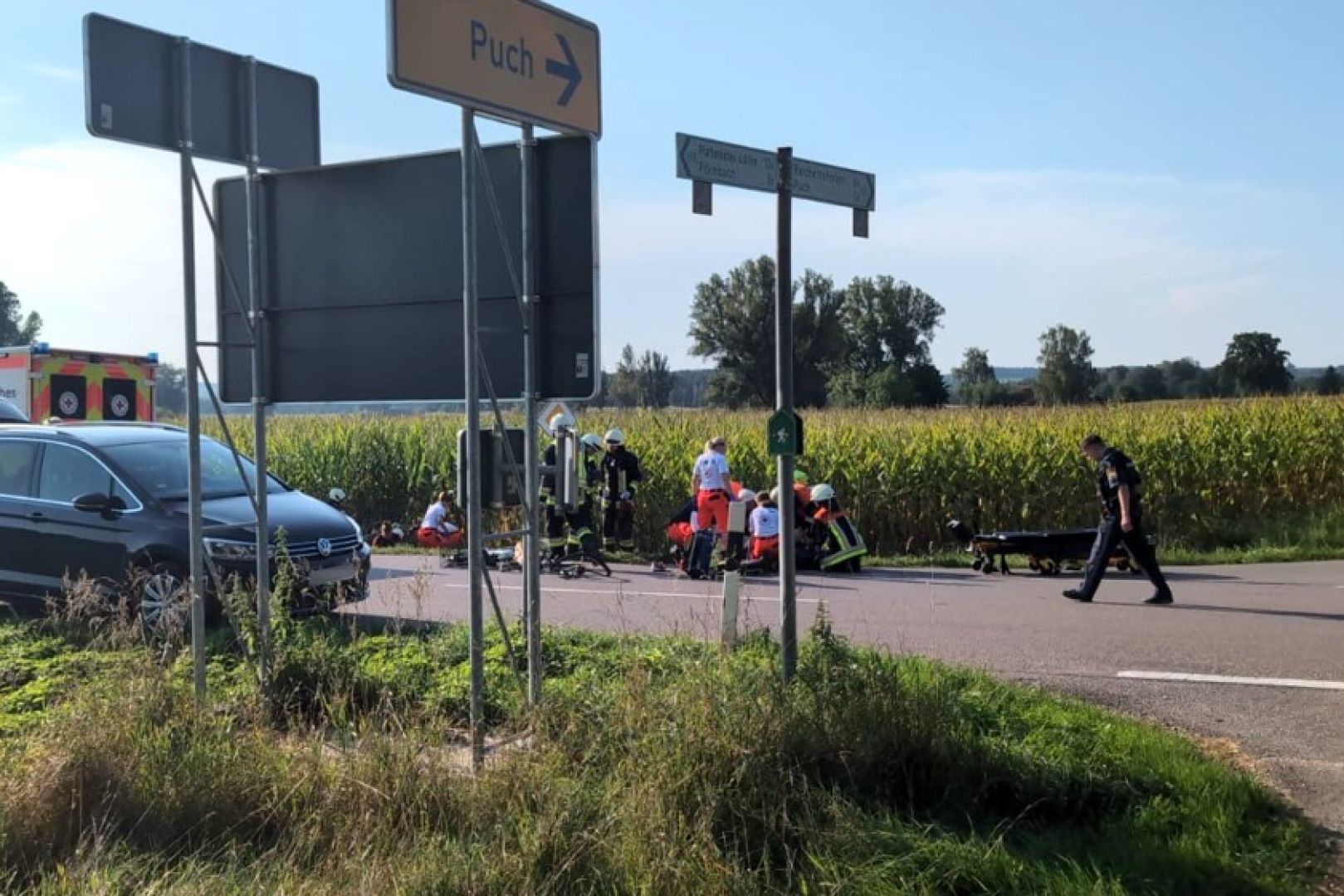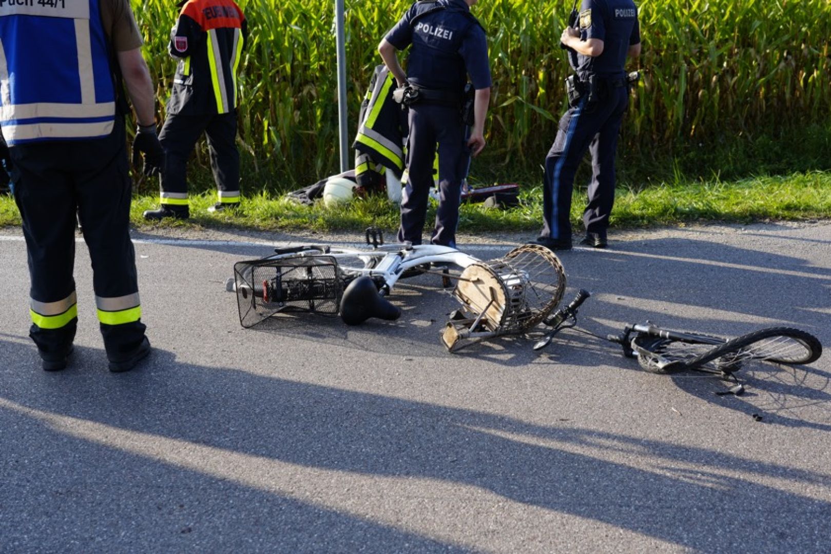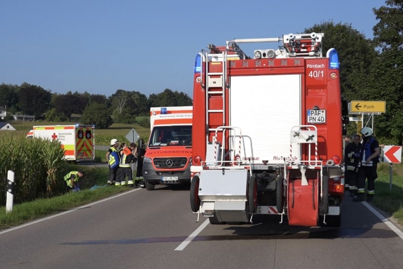 Jedenfalls kam es zu der folgenschweren Kollision. Im Kreuzungs-Bereich prallte nach Angaben der Polizei das Motorrad seitlich gegen die von links kommende Radlerin. Die 67-Jährige sei durch diesen Zusammenstoß auf den Asphalt geschleudert worden und bewusstlos liegen geblieben. Der Motorrad-Fahrer sei durch den Aufprall zu Sturz gekommen und neben der Straße zum Liegen gekommen. Auch er sei nicht mehr ansprechbar gewesen. Neben Streifenbeamten rückten zwei Rettungswagen, zwei Notarzt-Fahrzeuge, ein Rettungs-Hubschrauber sowie die Feuerwehren aus Puch und Pörnbach an.