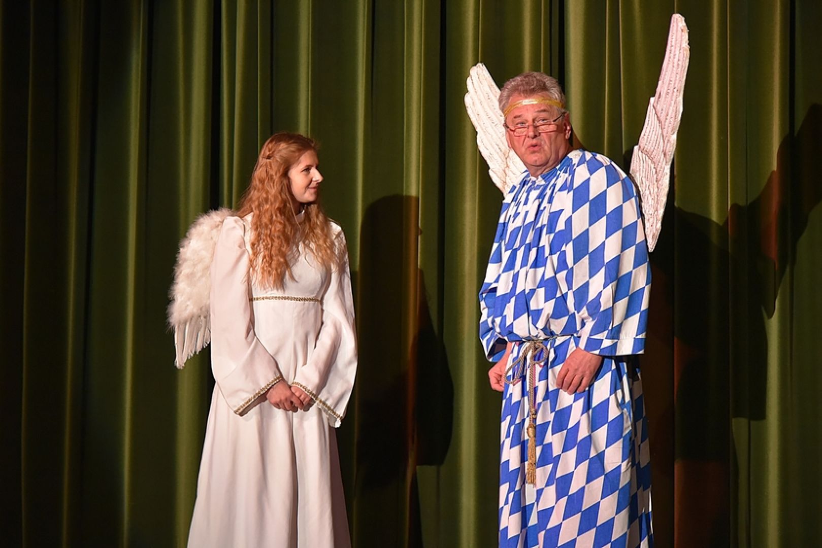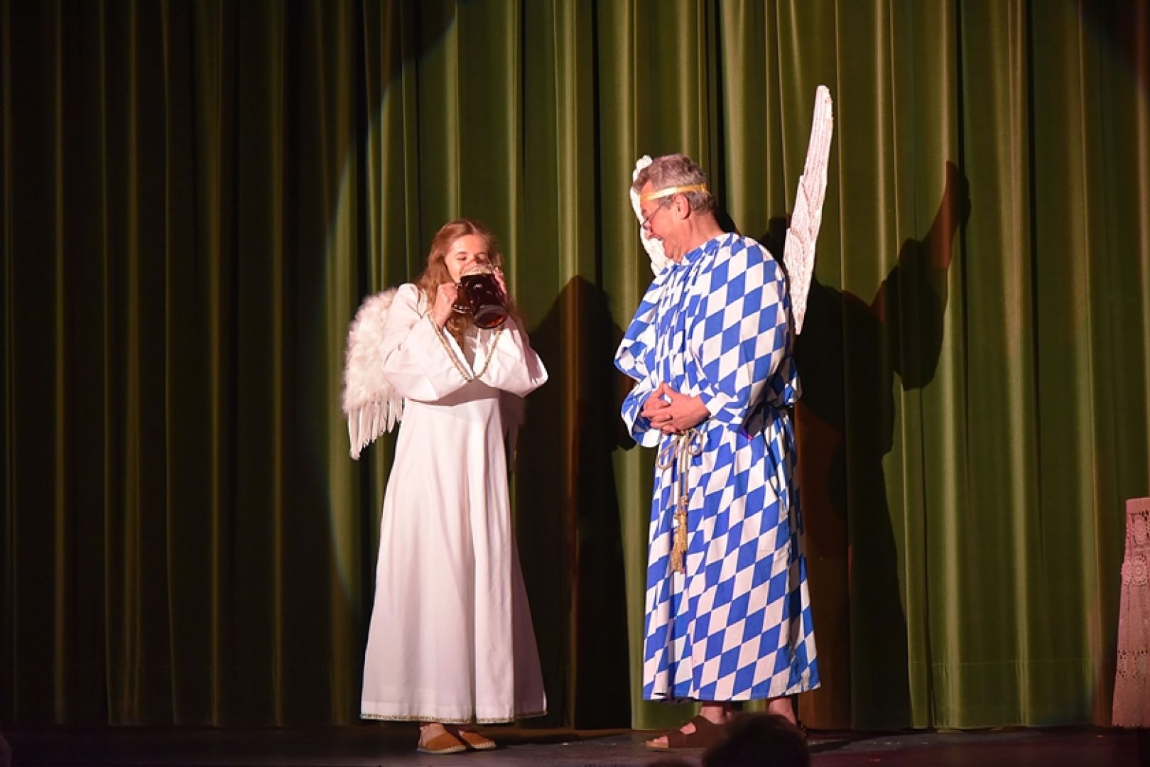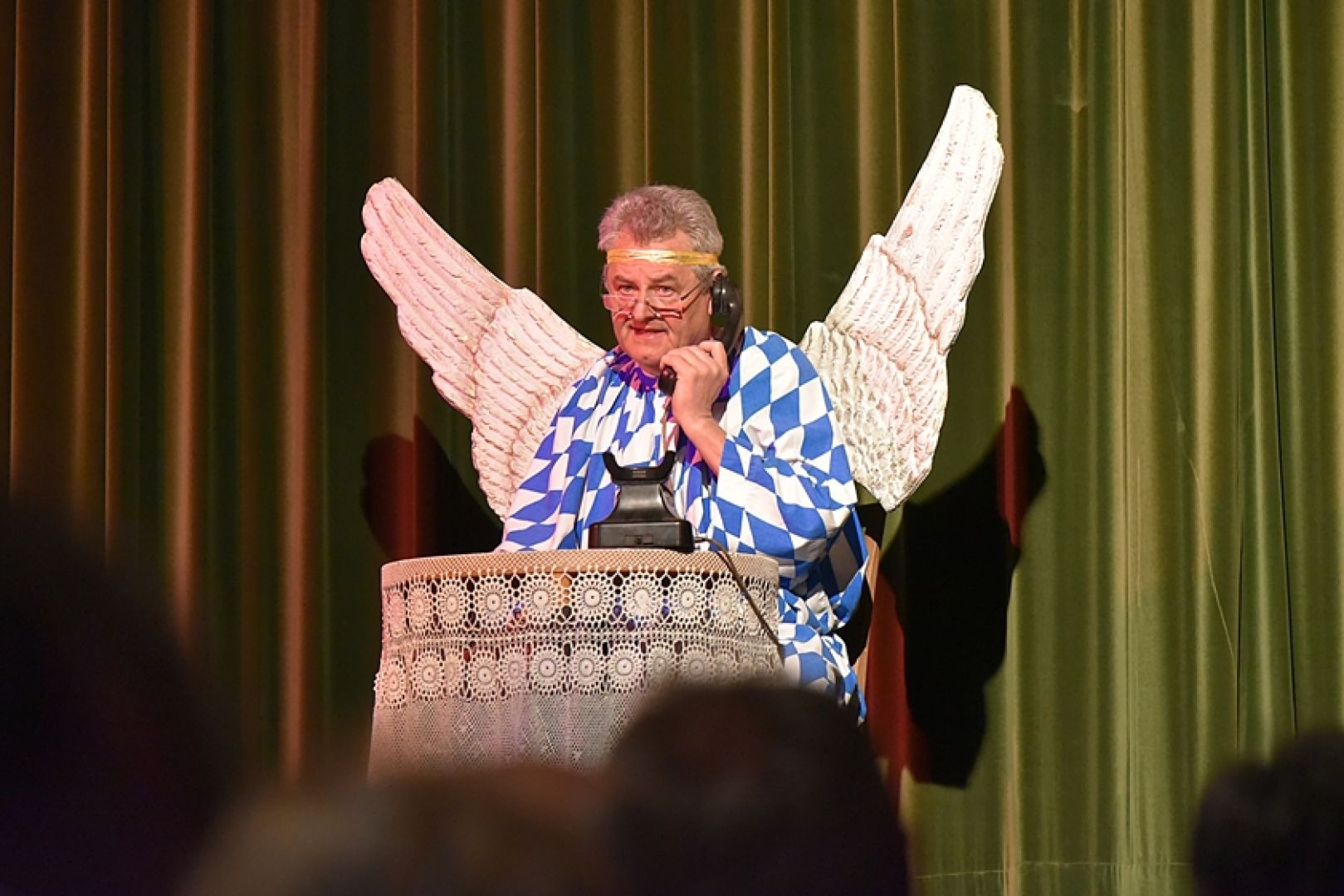 (ty) Urig und voller Witz: Das diesjährige Starkbierfest der Theaterbühne von Langenbruck hat schon zur Premiere am vergangenen Wochenende zahlreiche Besucher in die hiesige Pfarrer-Höfler-Halle gelockt. Neben süffigem Starkbier und zünftiger Musik stand im Mittelpunkt vor allem der satirische Auftritt des Engels Ambrosius, der mit scharfzüngigem Humor sowohl lokale als auch überregionale Ereignisse aufs Korn nahm. Darüber hinaus unterhielt das sehr gut vorbereitete Ensemble die Gäste mit gespielten Witzen, Couplets und kurzen Bühnenstücken. Es gibt weitere sieben Aufführungs-Termine.