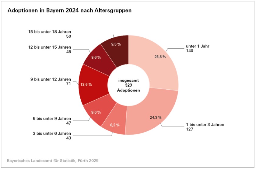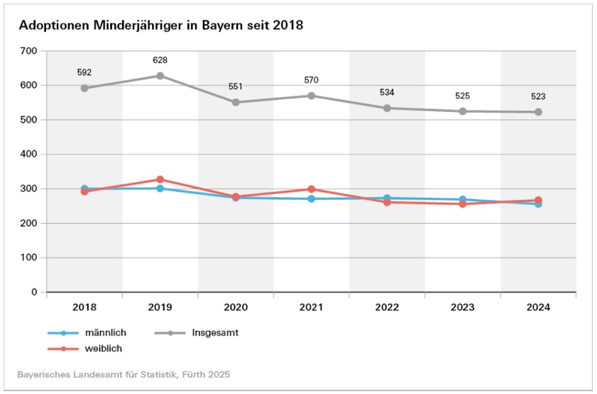 Mehr als die Hälfte der Adoptierten, nämlich 51,1 Prozent, waren zum Zeitpunkt ihrer Adoption jünger als drei Jahre. Im Durchschnitt waren die Minderjährigen 5,8 Jahre alt. Von den adoptierten Kindern und Jugendlichen verfügten 92,0 Prozent über die deutsche Staatsangehörigkeit. Die meisten nicht-deutschen Adoptierten stammten aus dem europäischen Ausland. "Im Zeitverlauf hält sich die Zahl adoptierter Minderjähriger in Bayern seit 2022 relativ konstant", erklärt die Behörde:" Nach einem Spitzenwert von 628 Adoptionen im Jahr 2019 ist jedoch ein leicht negativer Trend zu verzeichnen."